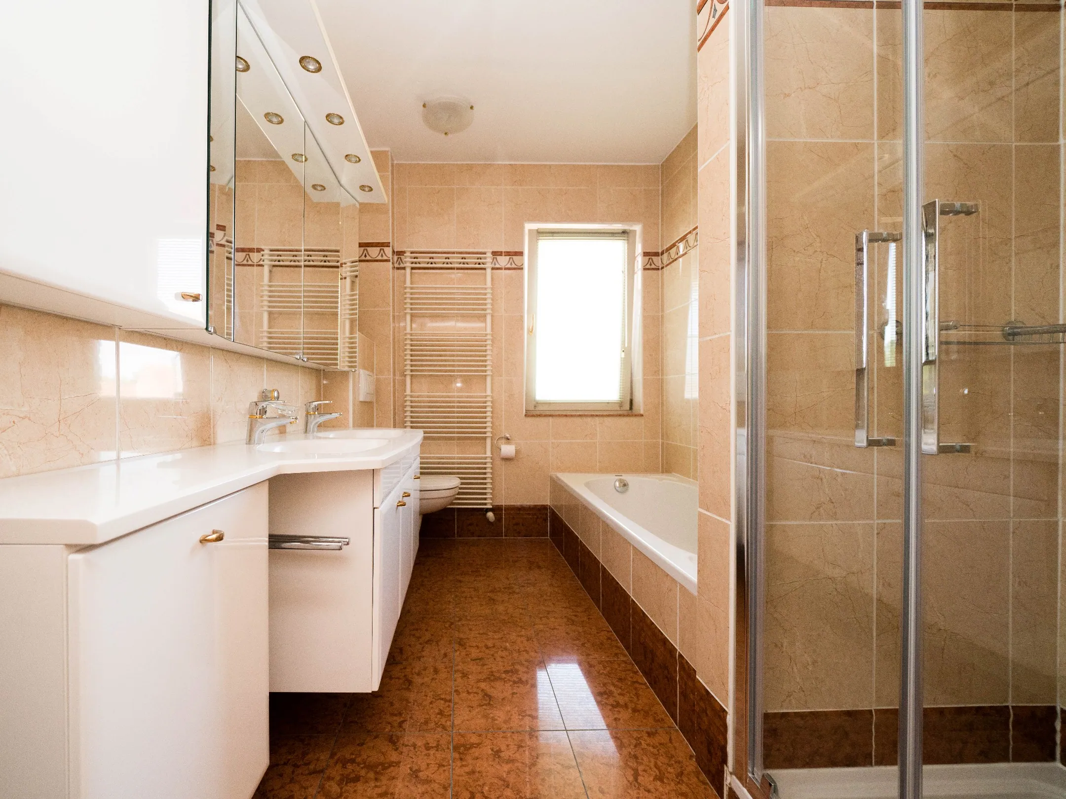 De nachthal leidt tot 2 mooie slaapkamers waarvan één met ingebouwde dressing en toegang tot een terrasje alsook de badkamer voorzien van zowel ligbad, douche, dubbele wastafel als toilet. In de inkomhal bevindt zich een tweede, afzonderlijk toilet alsook een berging met aansluitingen voor wasmachine/droogkast.