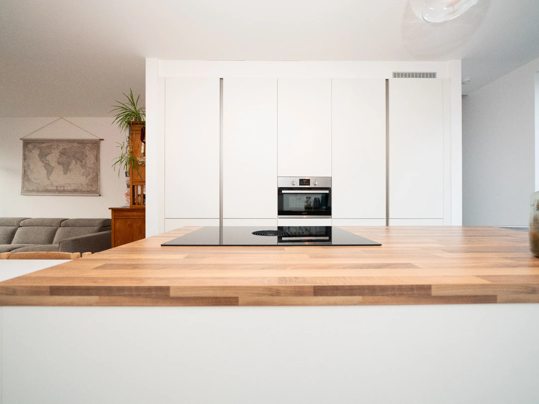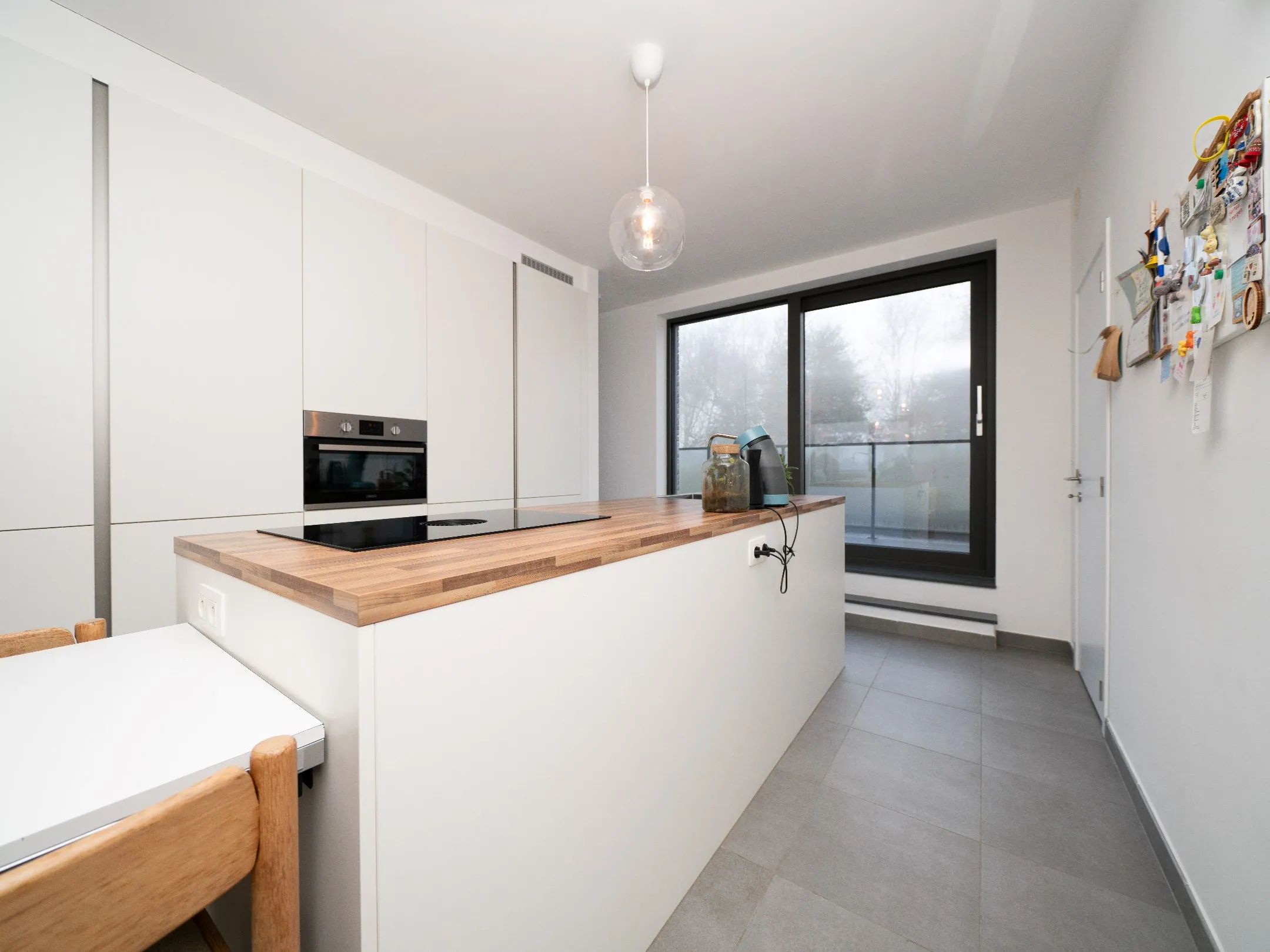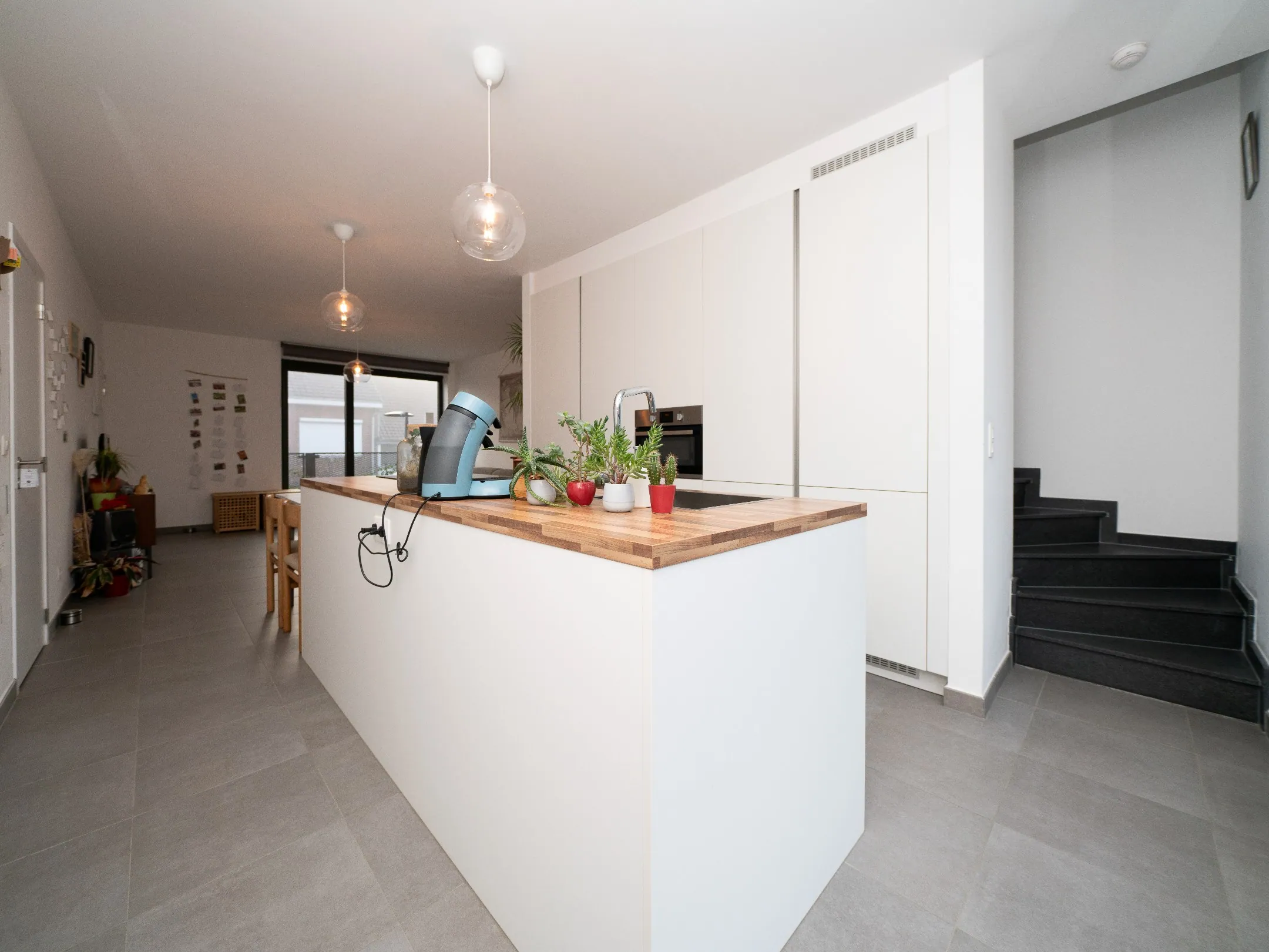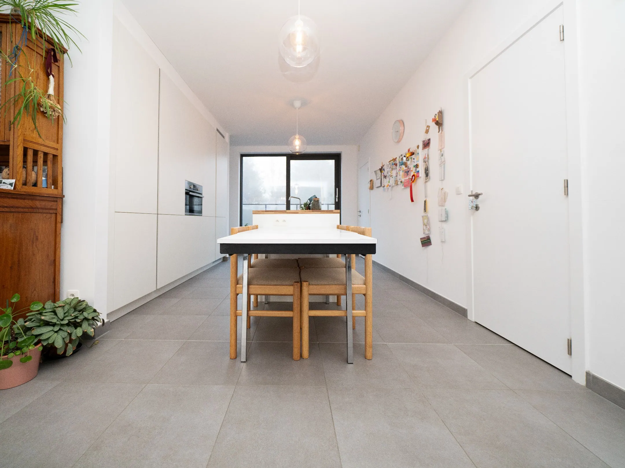 De strakke, witte keuken komt met alles erop en eraan. Zo vind je hier een combioven, een inductieplaat met afzuiging, een grote koelkast, vaatwasser en heel wat kastruimte. Een plezier om hier achter de kookpotten te staan.