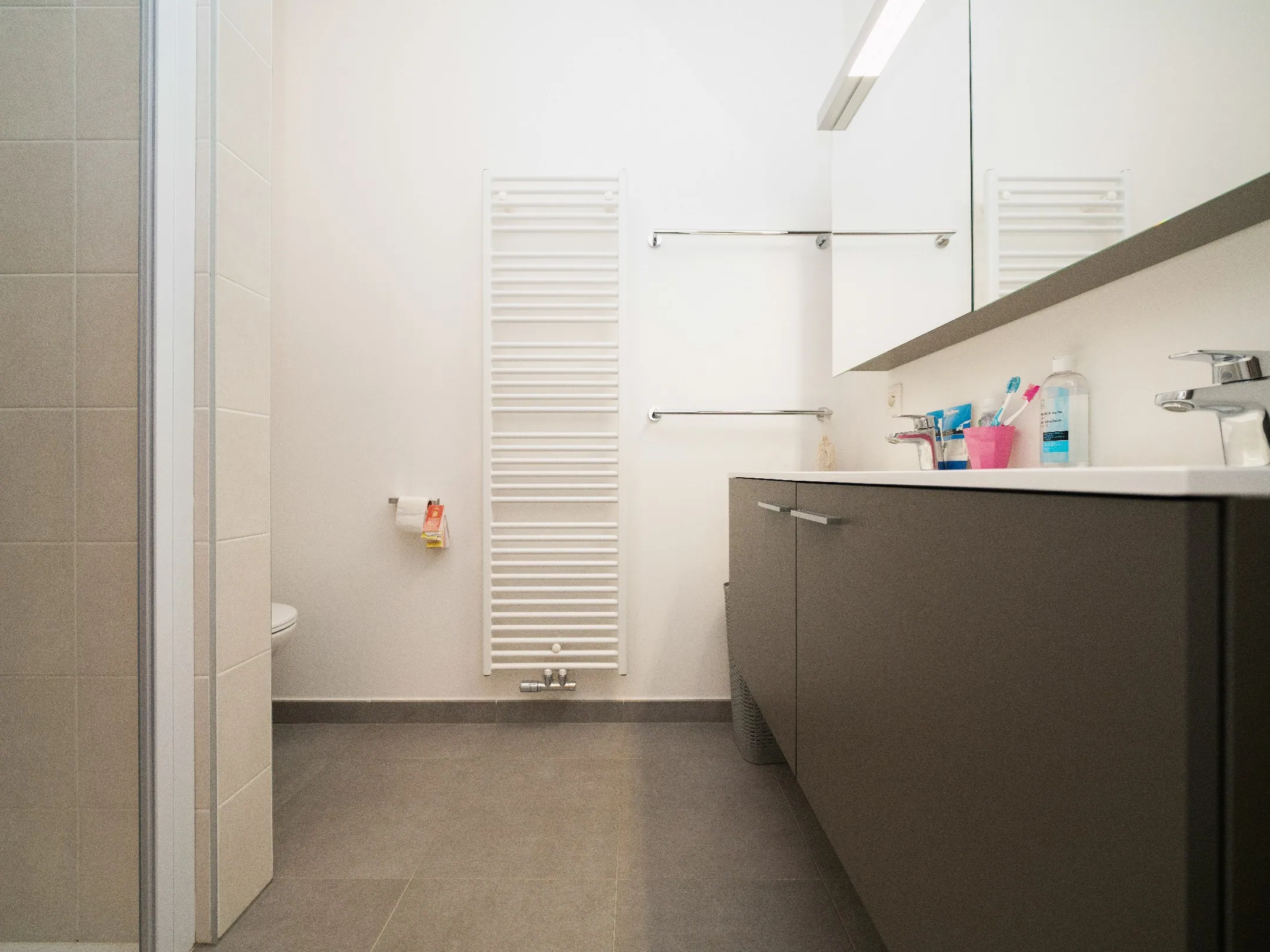 Achter de keuken zit de trap netjes verscholen. Deze brengt ons naar de 2 slaapkamers (12m² - 14m²) en de badkamer. In de badkamer vind je een douche, dubbele wastafel en 2de toilet. De masterbedroom geeft toegang tot een 3de terras.