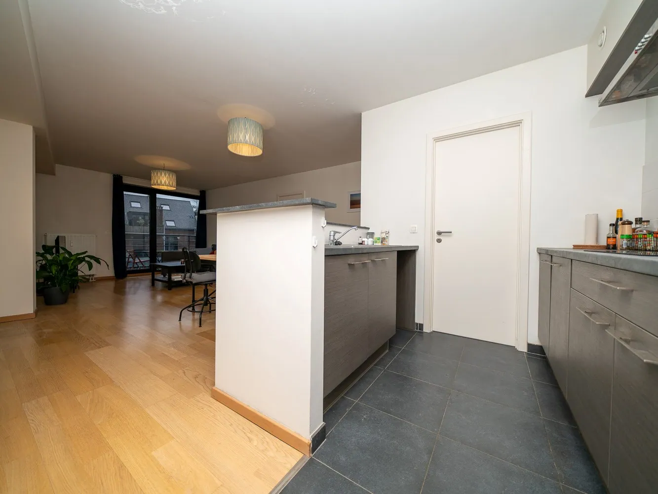 De leefruimte met open keuken is een gezellige, lichtrijke ruimte en geeft toegang tot een aangenaam terras.
