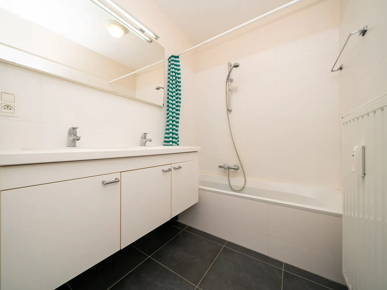 Vanuit de woonkamer heeft men toegang tot de ruime slaapkamer (14,5m²) met on suite badkamer voorzien van een dubbele wastafel en bad.