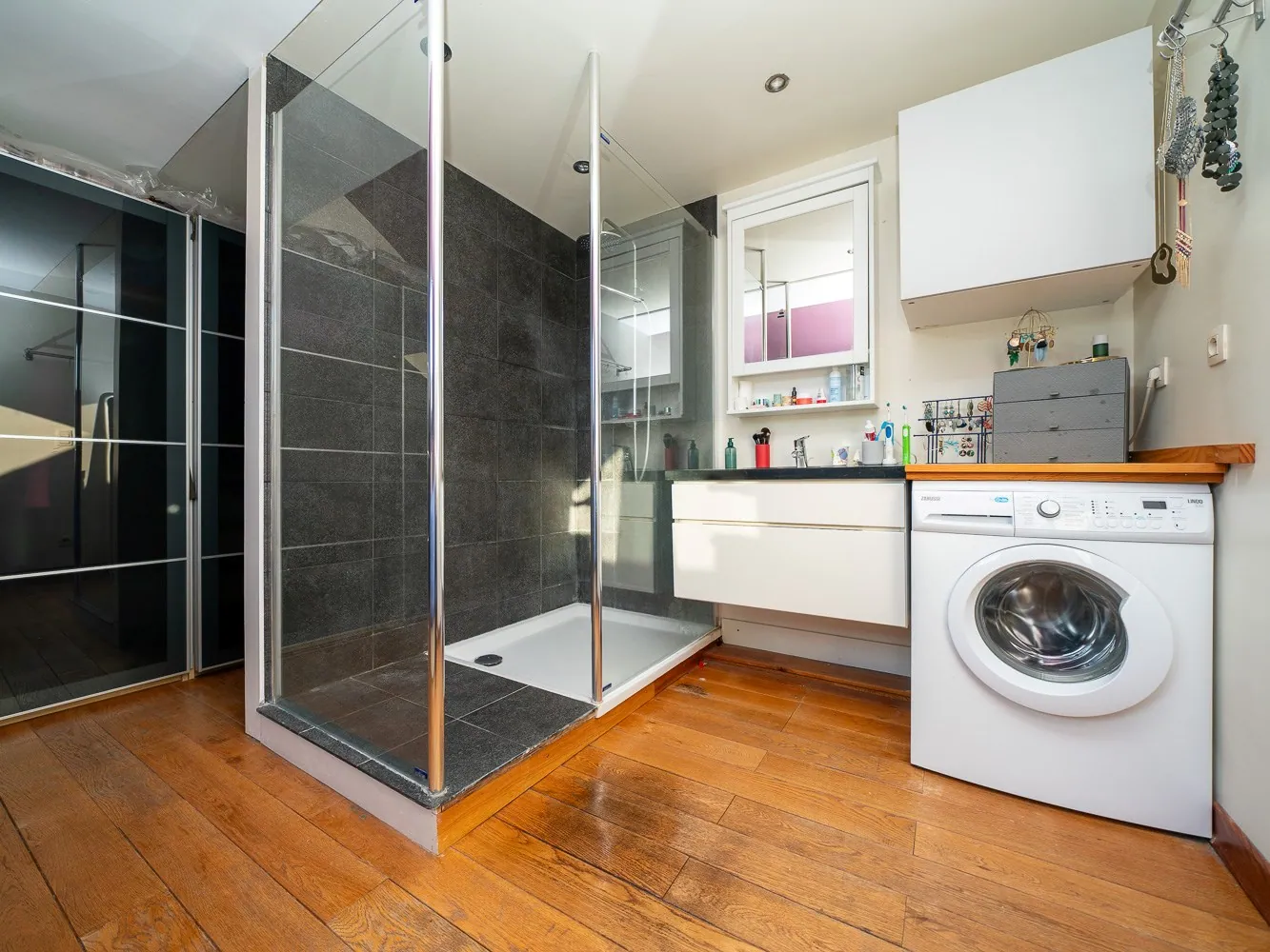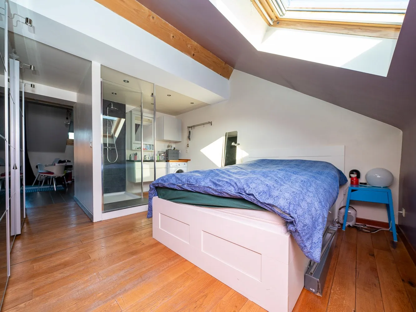 Vanuit de leefruimte hebben we toegang tot de eerste slaapkamer met walk-in dressing en ensuite badkamer met douche, enkele wastafel en aansluiting wasmachine. De trap brengt ons naar een mansarde kamer (10m²) die dienst kan doen als kinderkamer of bureau. Hier vinden we tevens een zolderruimte waar zich de condensatieketel op gas bevindt.