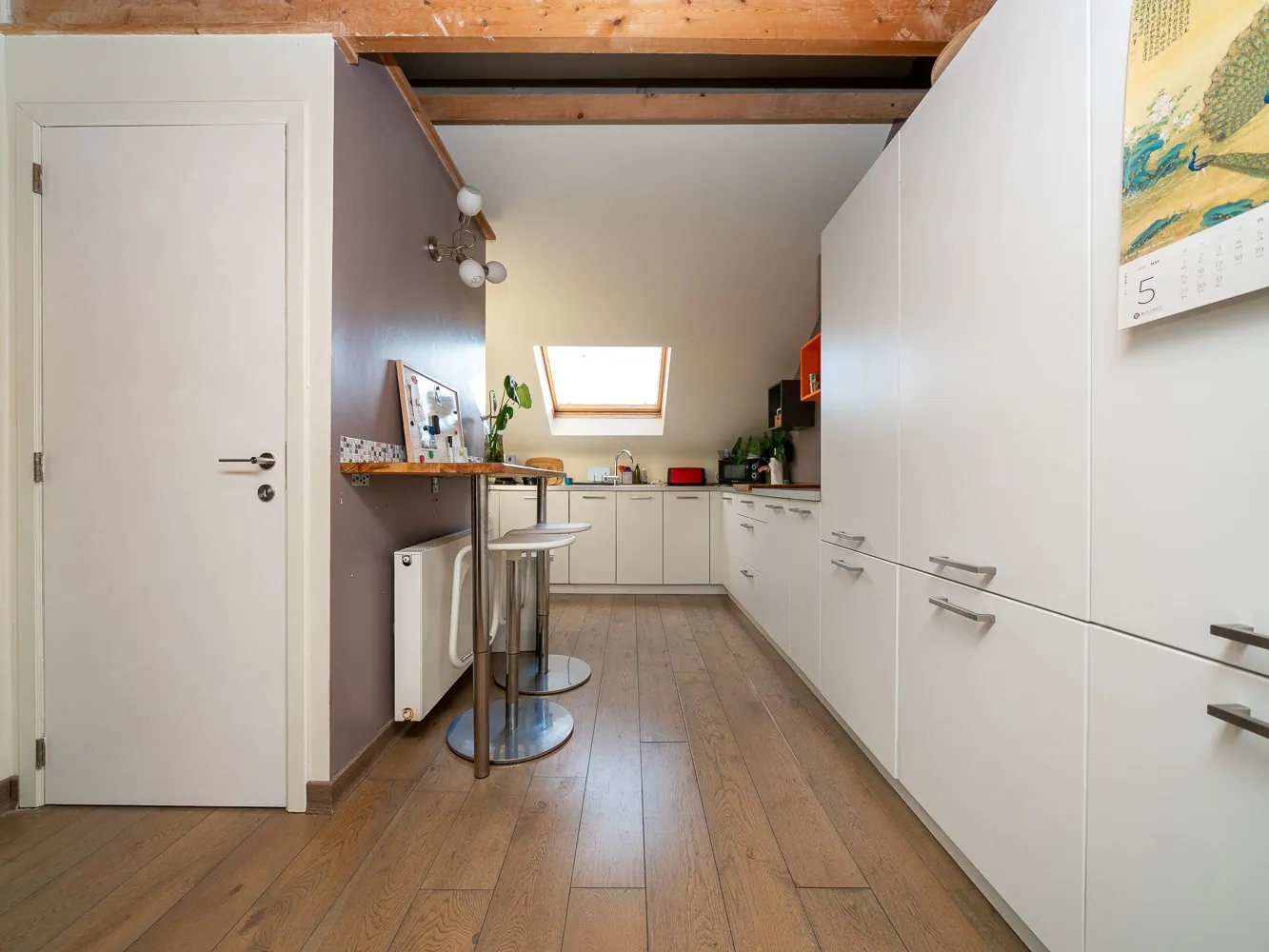 De loft is gelegen op de 3de en hoogste verdieping (zonder lift). Het appartement betreden we via de inkomhal met gastentoilet en handwasser. Verder door vinden we links de volledige uitgeruste keuken voorzien van Siemens toestellens en rechts de mooie leefruimte. Zowel de parketvloer als de hoge plafonds geven de ruimte bijzonder veel karakter. De keuken is voorzien van een mezzanine die goed benut kan worden als extra opbergruimte.