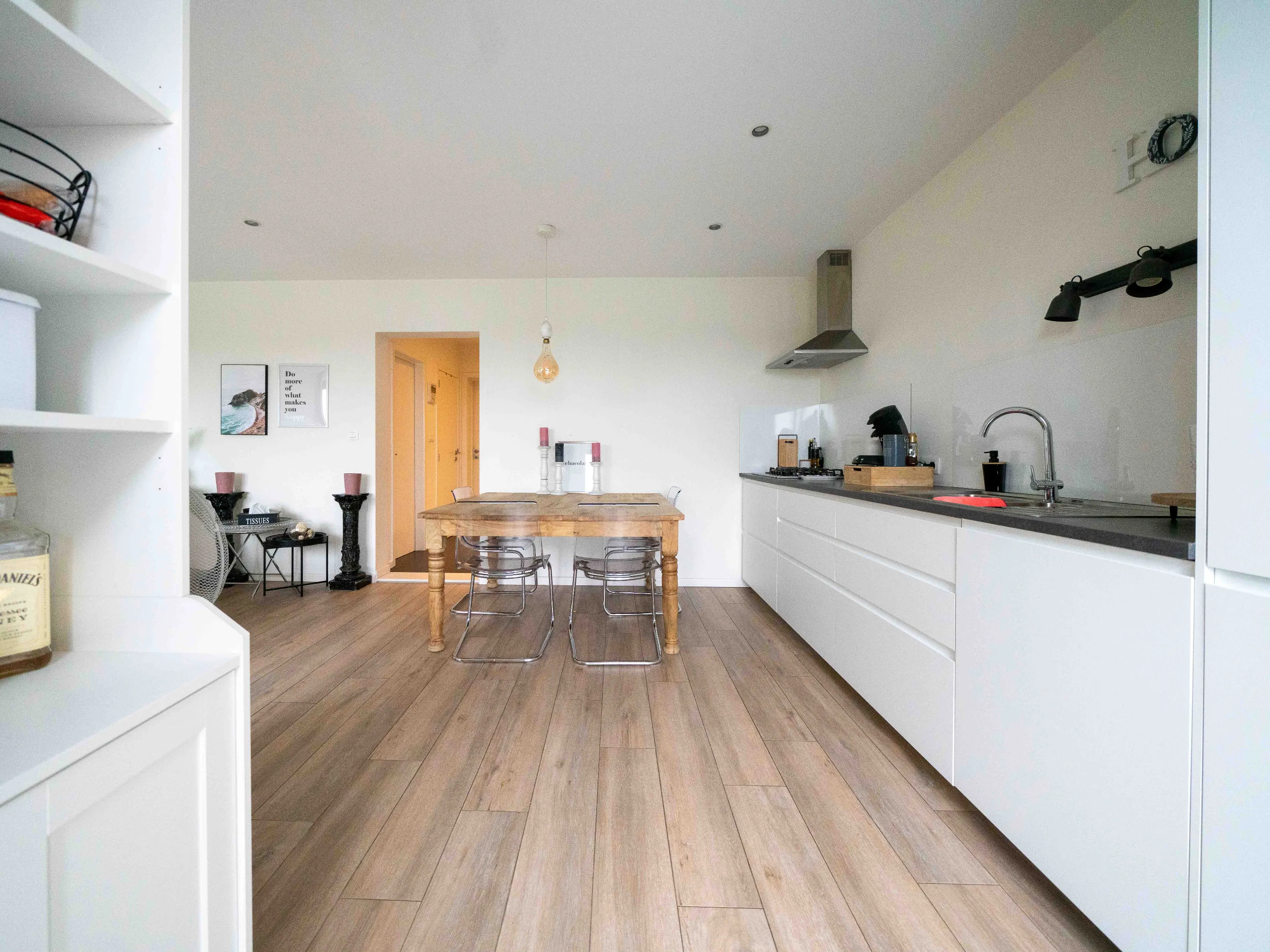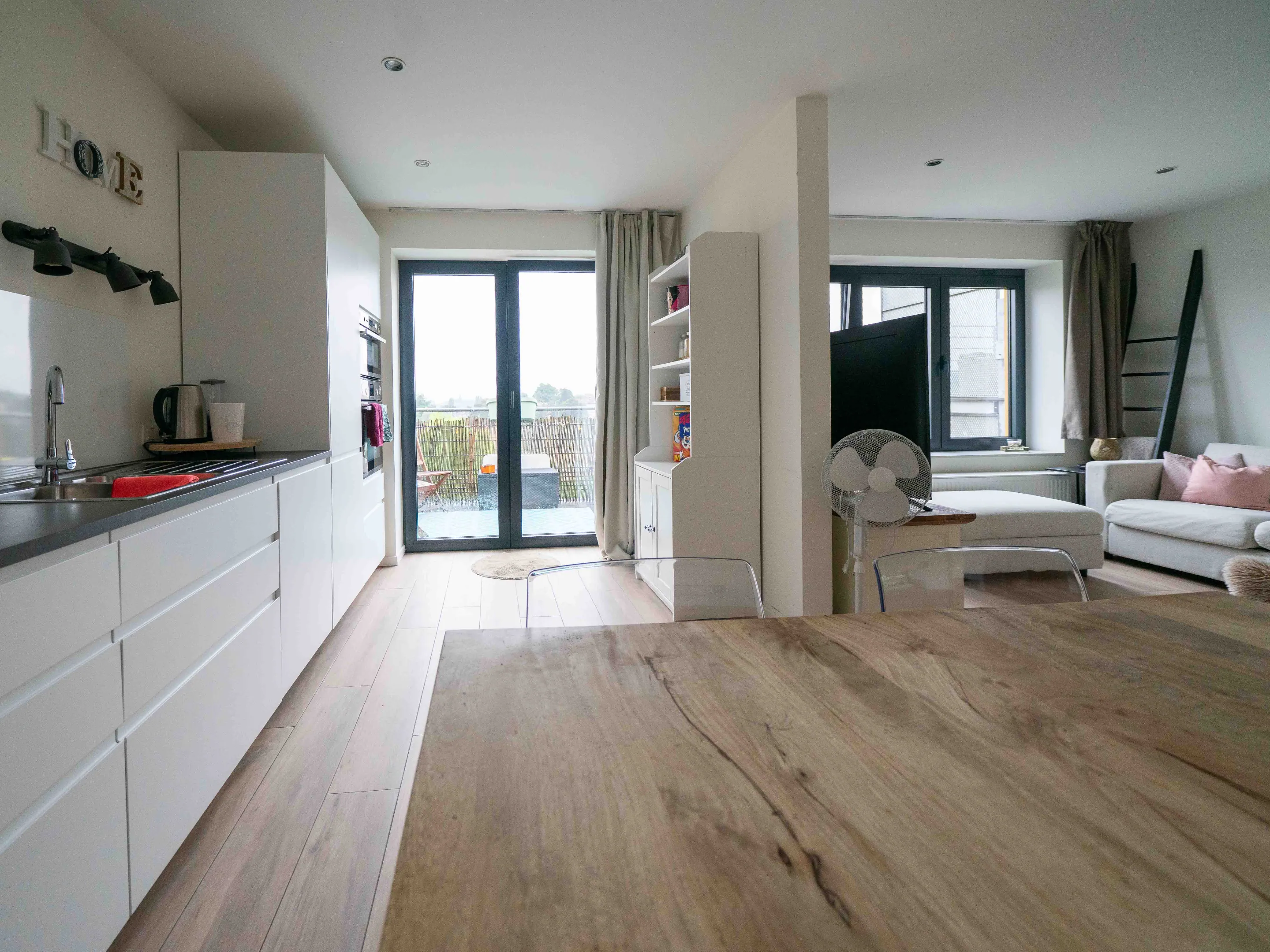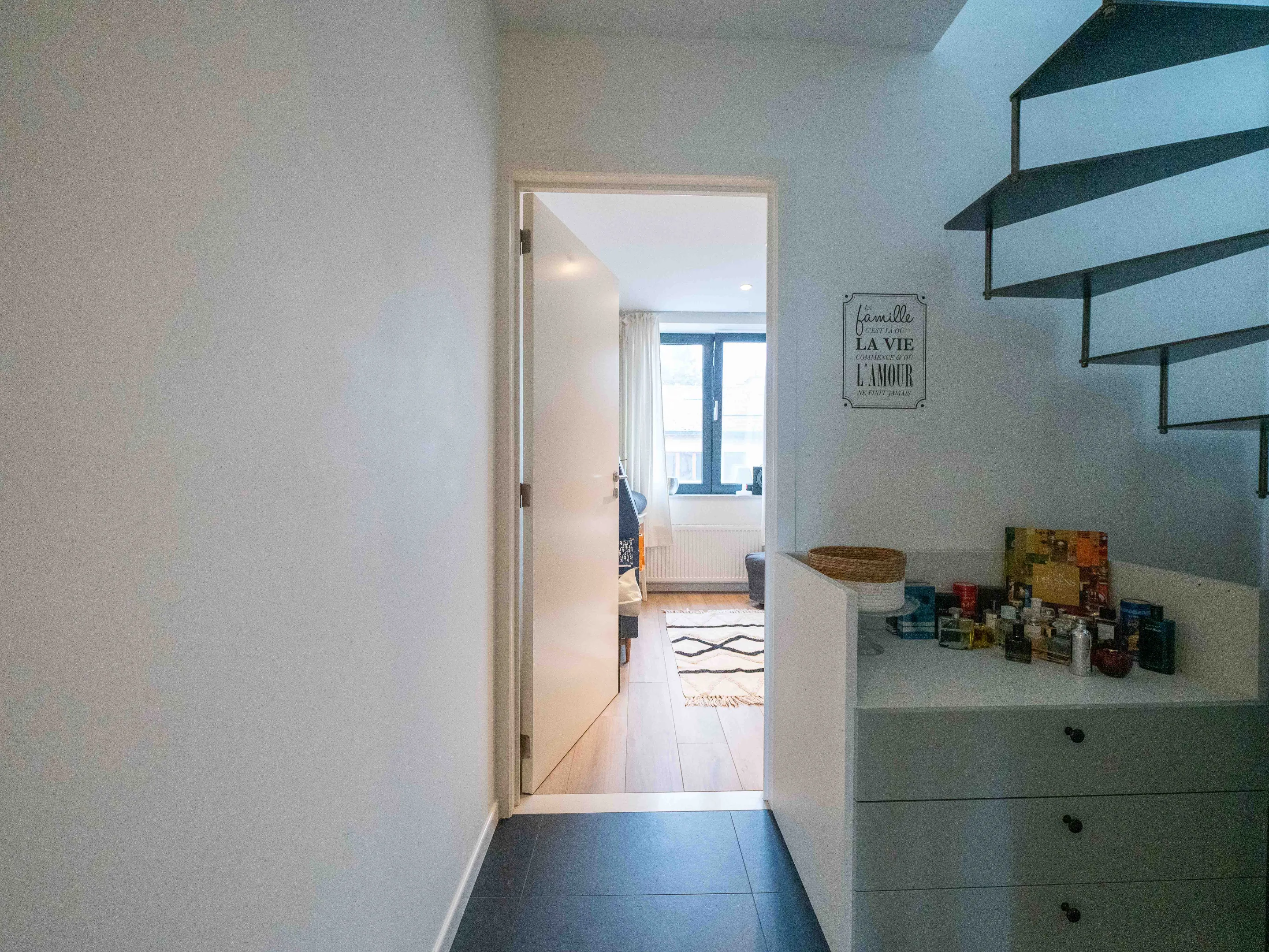 Het appartement werd met veel smaak ingericht: mooie parkettegel in de leefruimte, strakke witte keuken, bamboeparket op de verdieping en een mooie stalen trap.