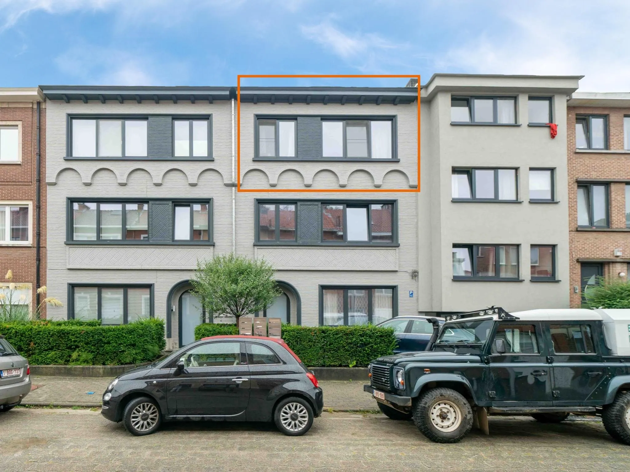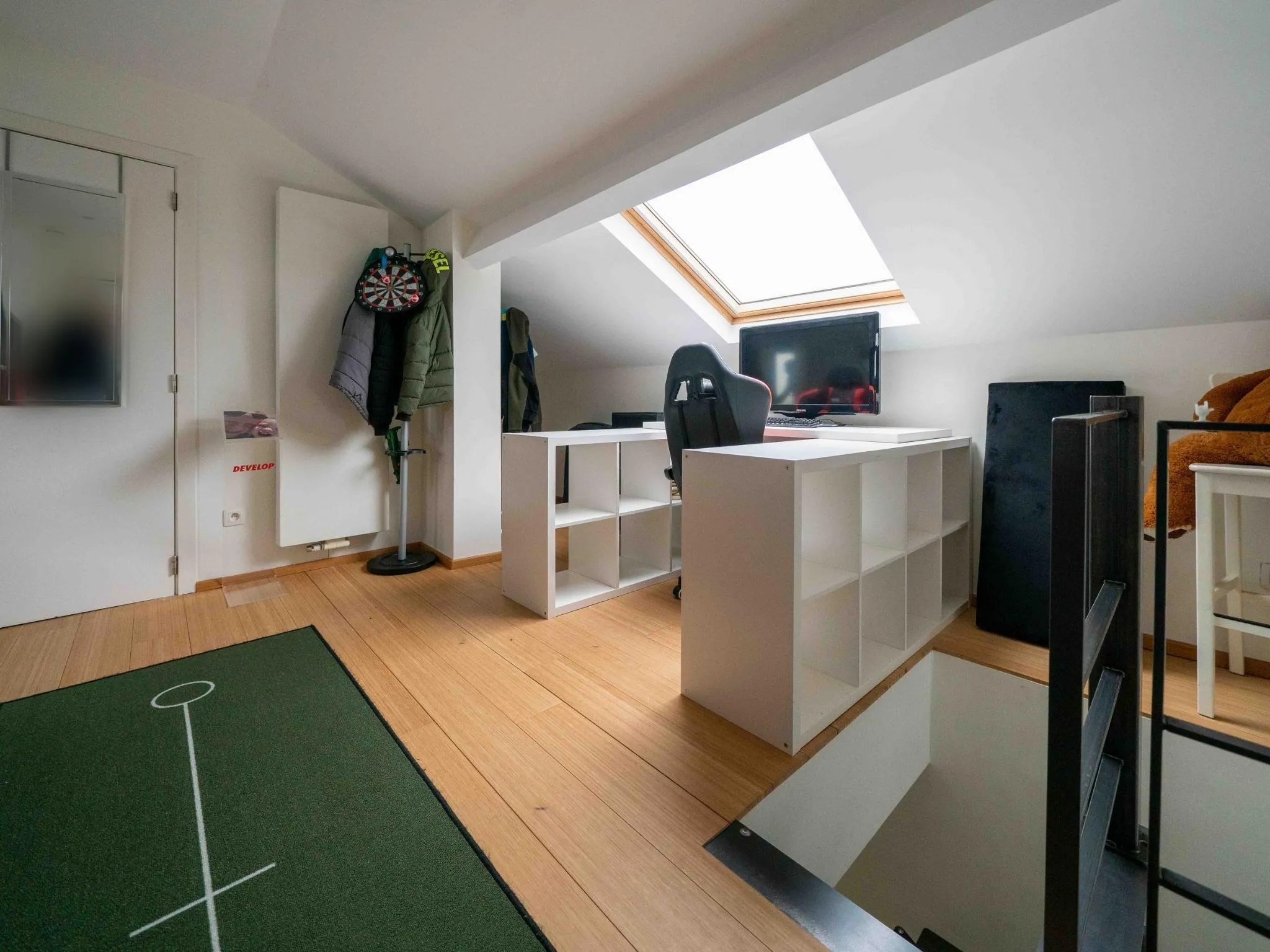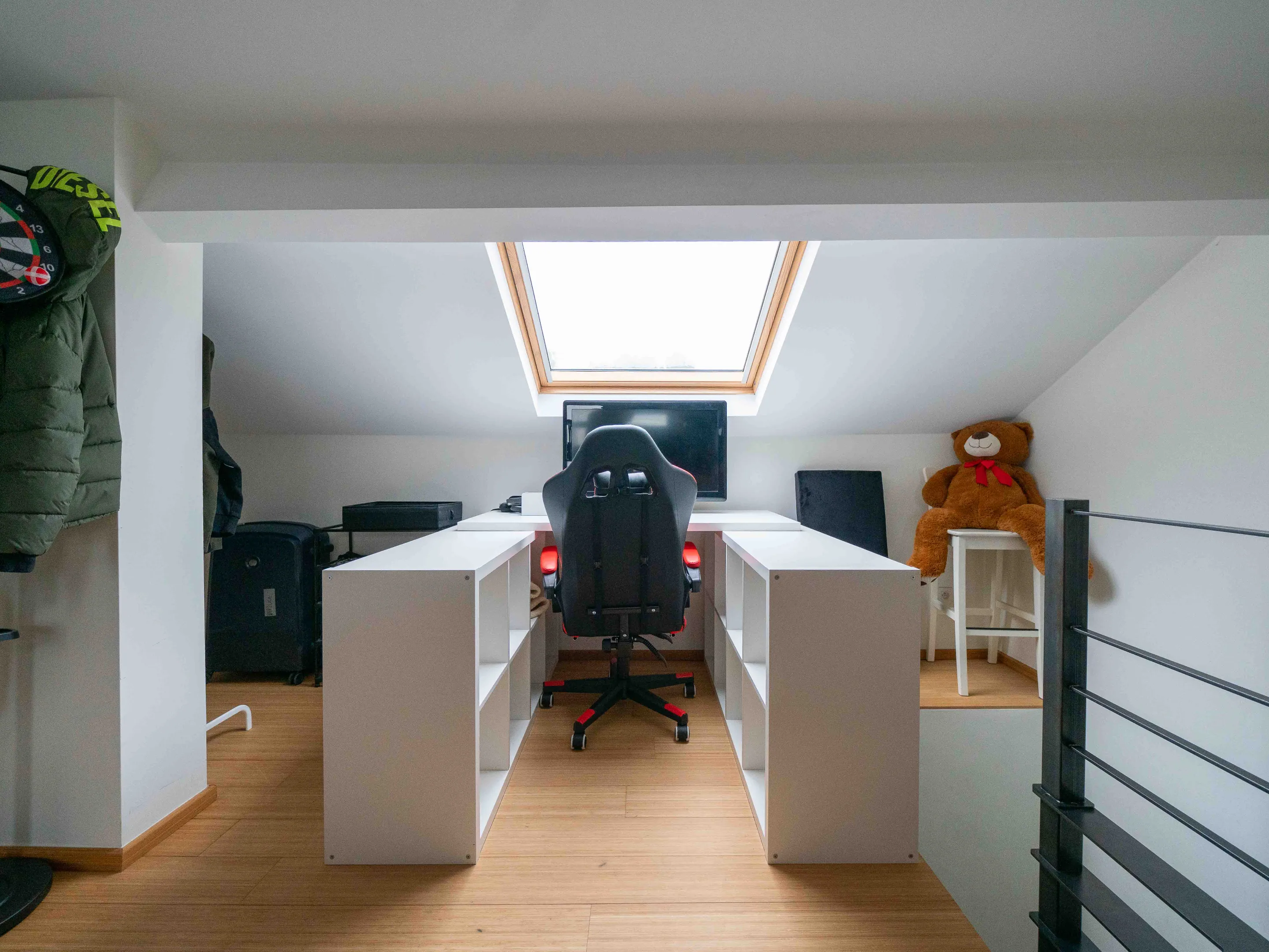 Het appartement werd met veel smaak ingericht: mooie parkettegel in de leefruimte, strakke witte keuken, bamboeparket op de verdieping en een mooie stalen trap.
