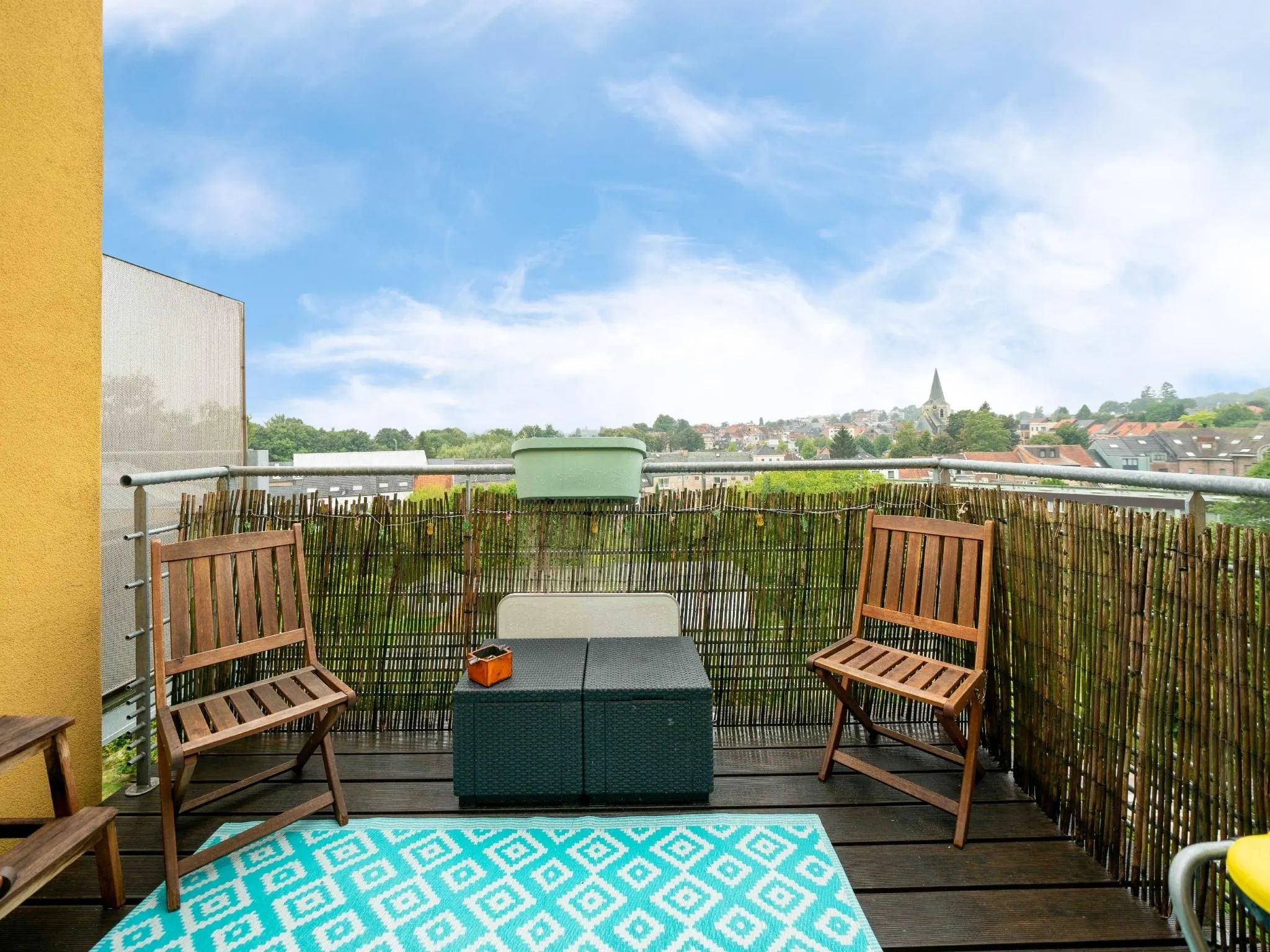 De keuken is volledig uitgerust: gasvuur, vaatwasser, (microgolf)oven, frigo met vriesvak en geeft toegang tot een zonnig terras (6m²). Zowel de leefruimte als de slaapkamers zijn voorzien van vliegenramen.