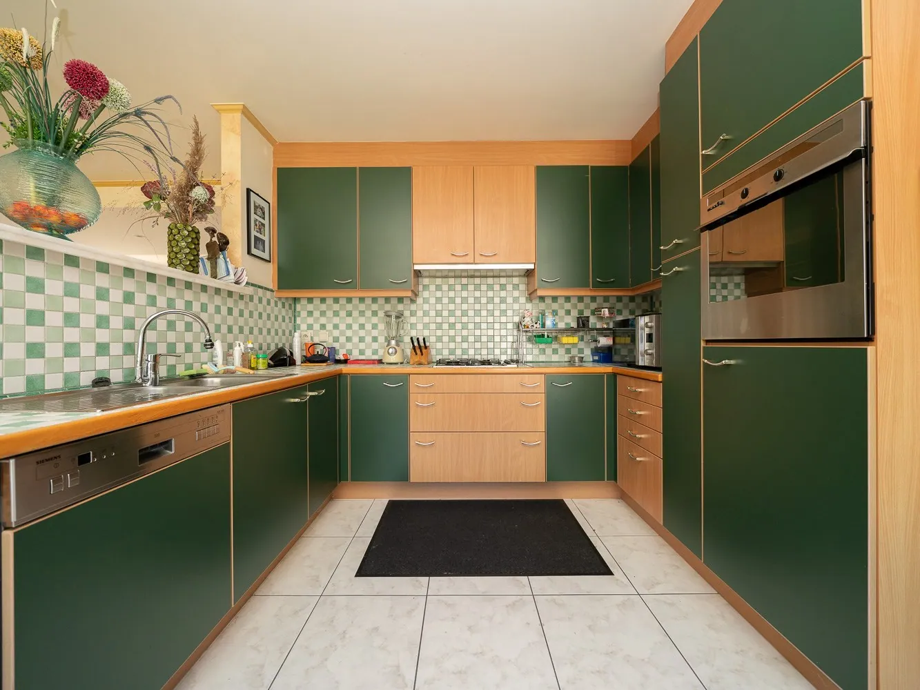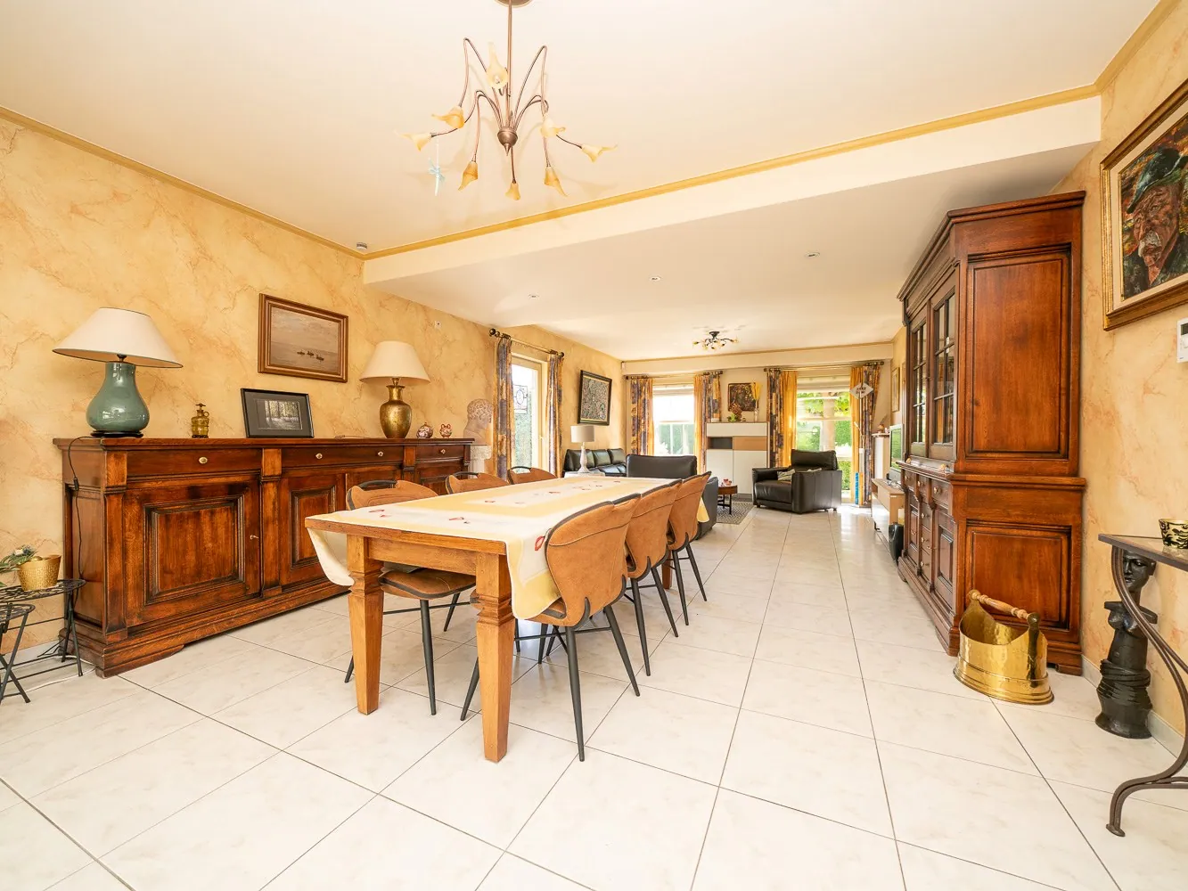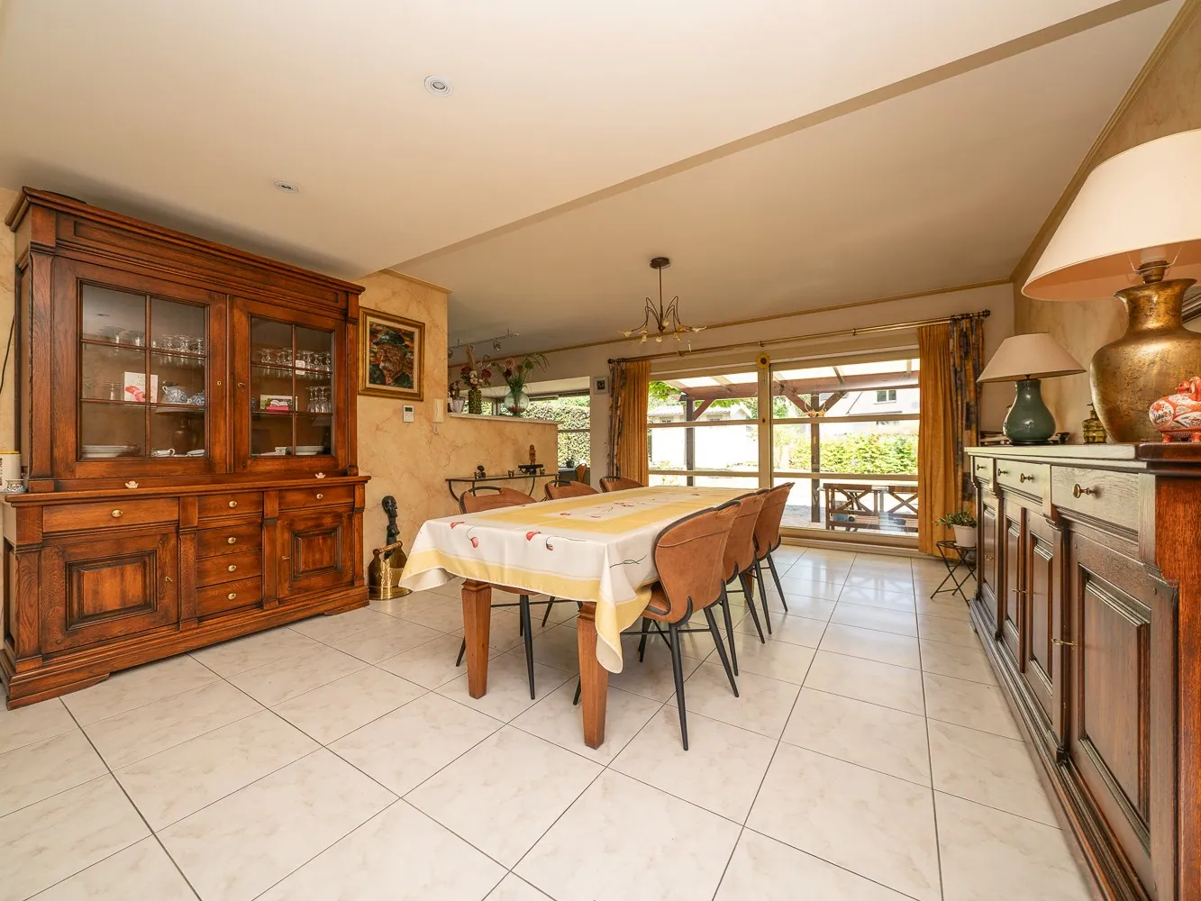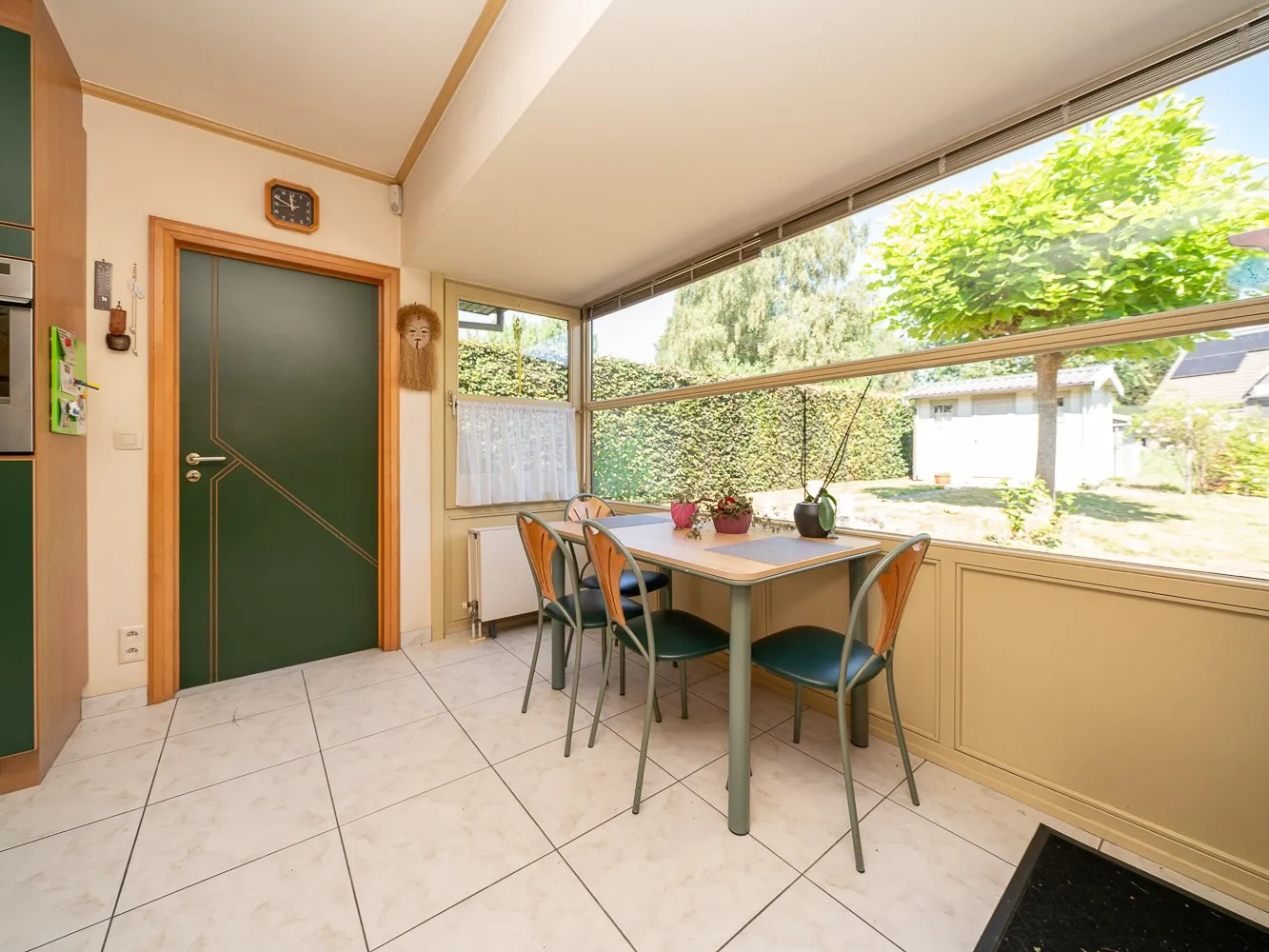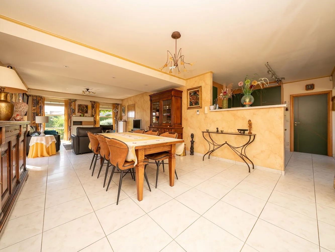 Vervolgens betreden we de leefruimte van 41m². De semi open, geïnstalleerde keuken (13,5m²) met ontbijthoek geeft toegang tot de achtergelegen bergruimte/wasplaats alsook garage. Vanuit de eetkamer hebben we via een groot schuifraam toegang tot het terras en de tuin.