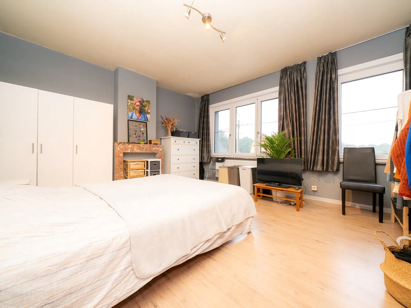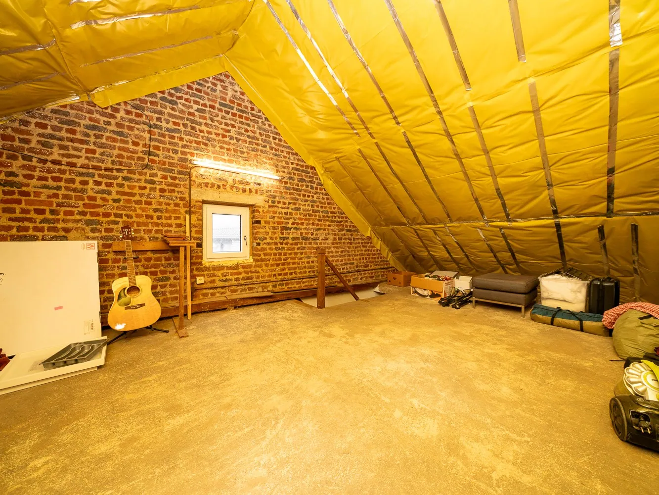 Volg je vanuit de woonkamer de trap naar de eerste verdieping, dan vind je hier een eerste, riante slaapkamer van 19m² en een tweede van 13m². Vanuit de tweede kamer heb je via een vaste trap toegang tot de in te richten, maar zeer ruime zolder (26m²) die dienst kan doen als 3e kamer.