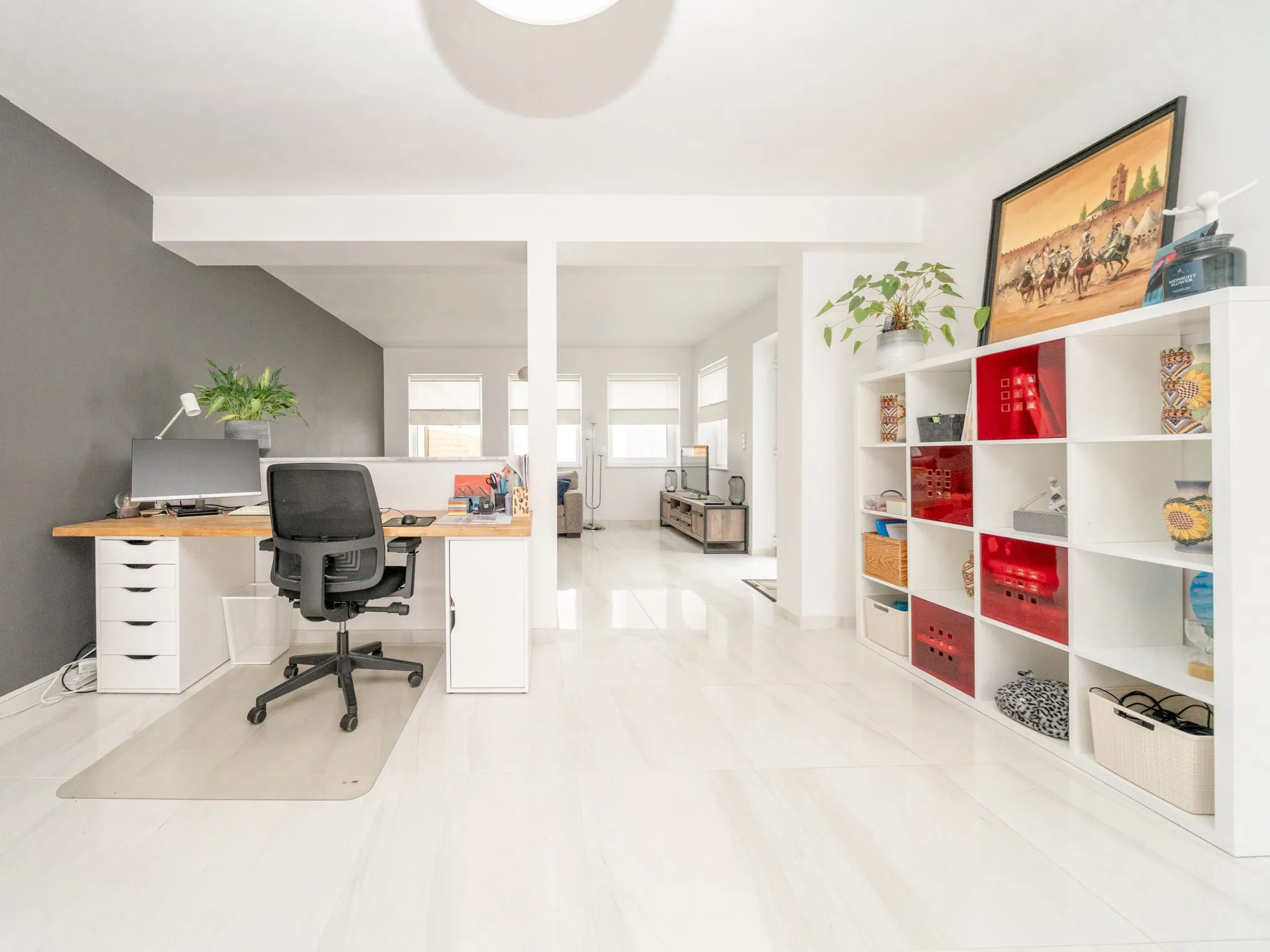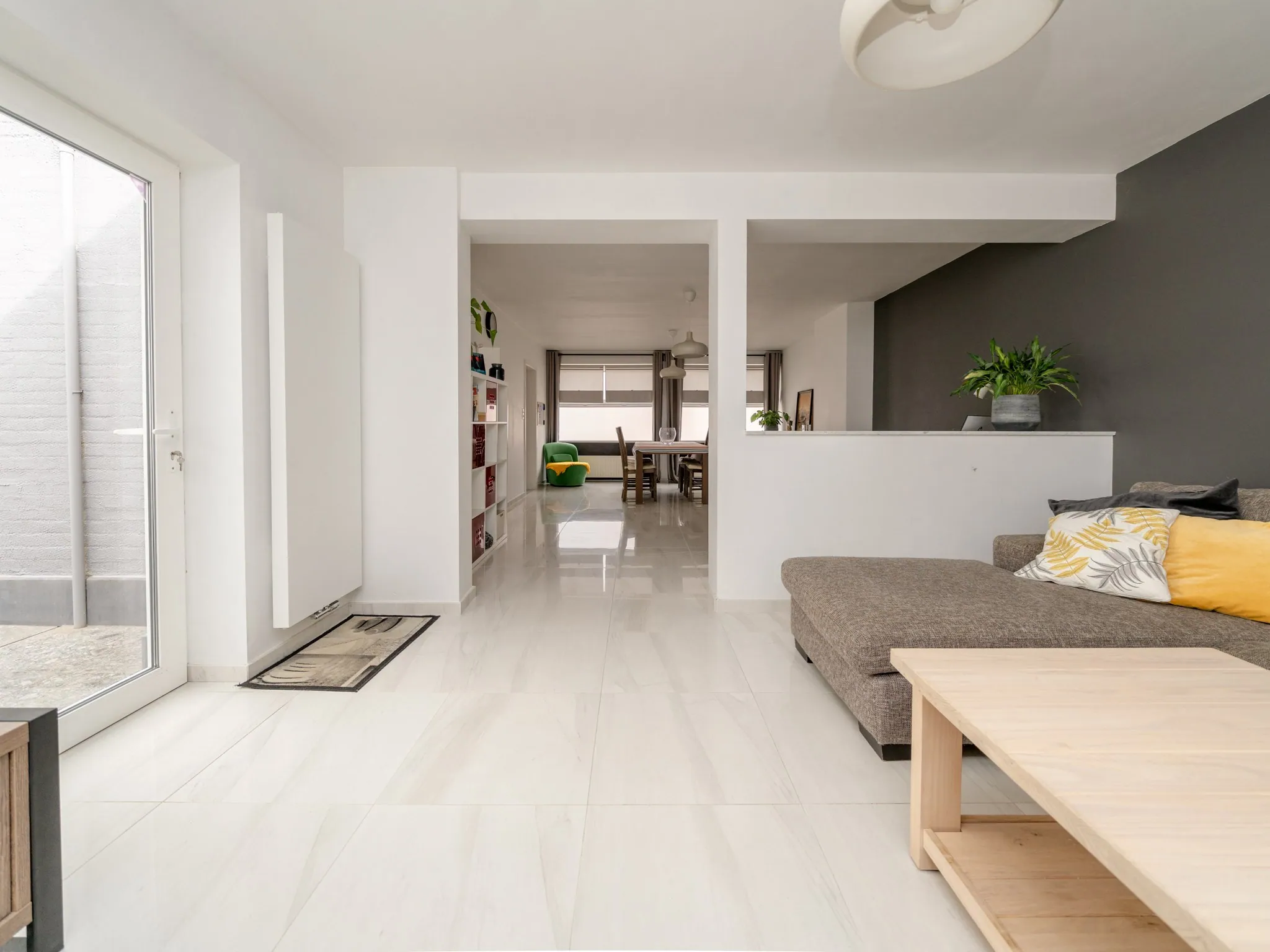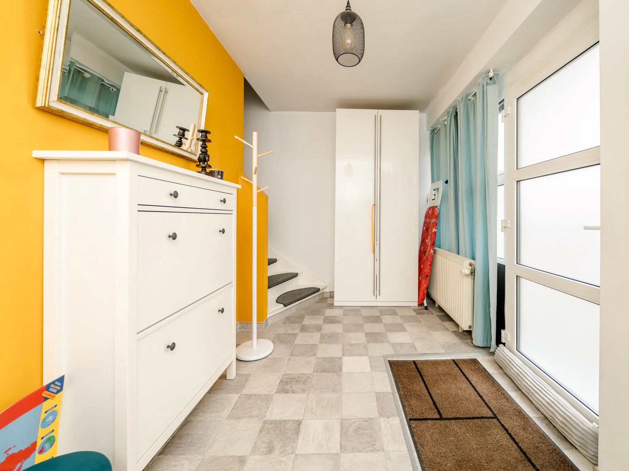 De woning betreden we via een praktische inkomhall (10m²) waar je jassen, schoenen, … makkelijk kwijt kan in één van de vestiairekasten.