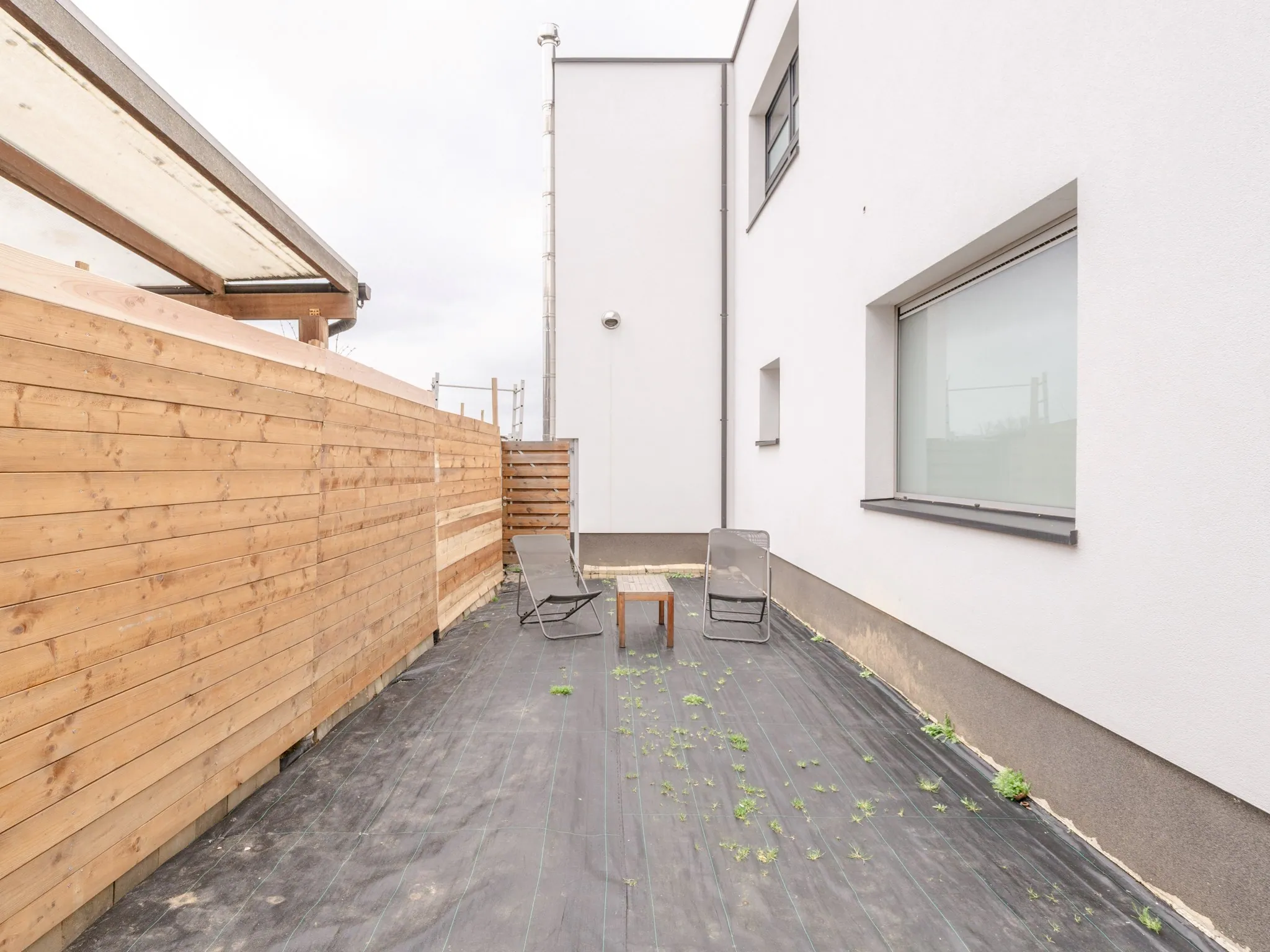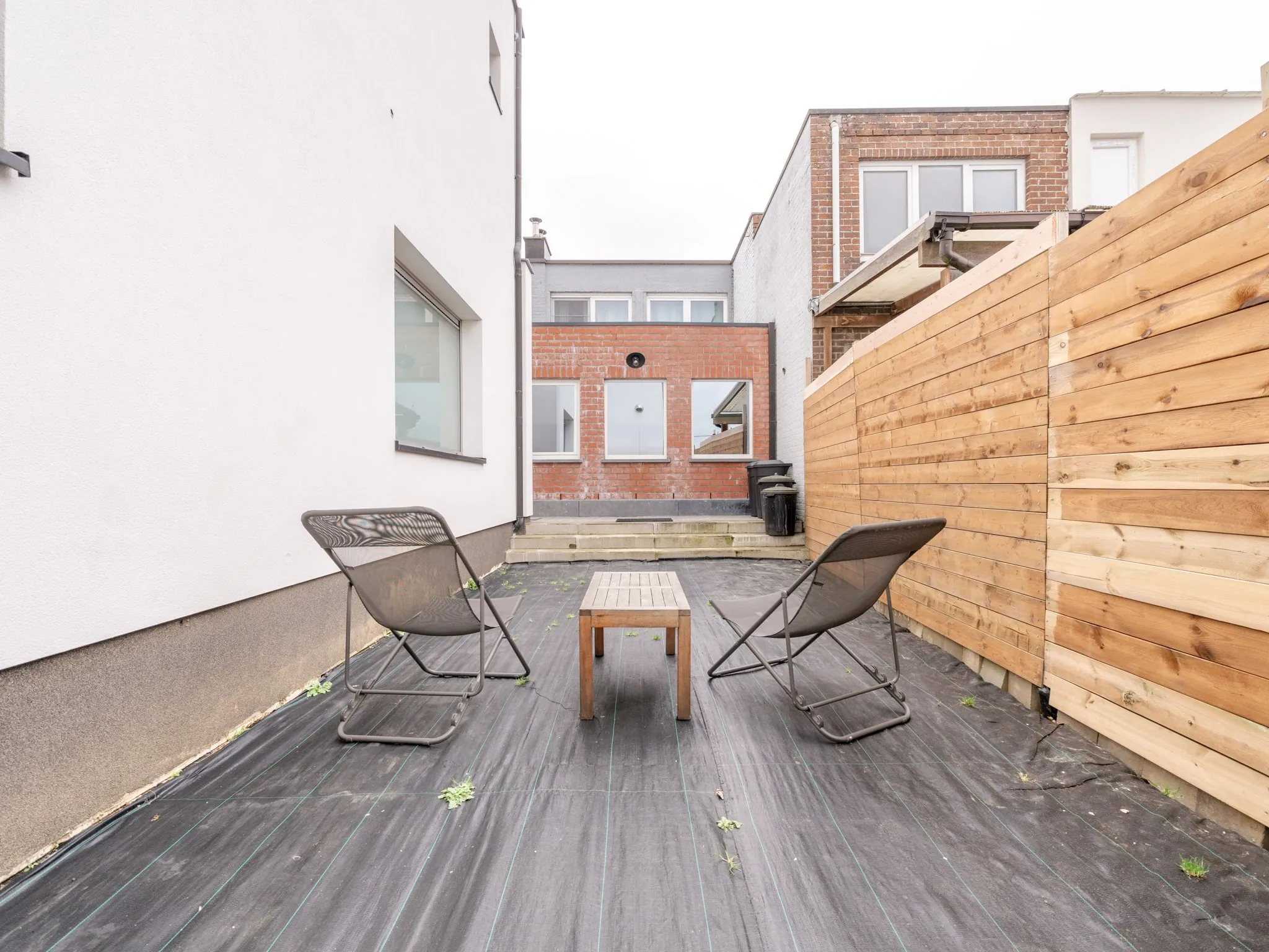 De tuin is nog aan te leggen maar biedt zeer veel privacy. Vooraan de woning is plaats voor 2 auto’s.
