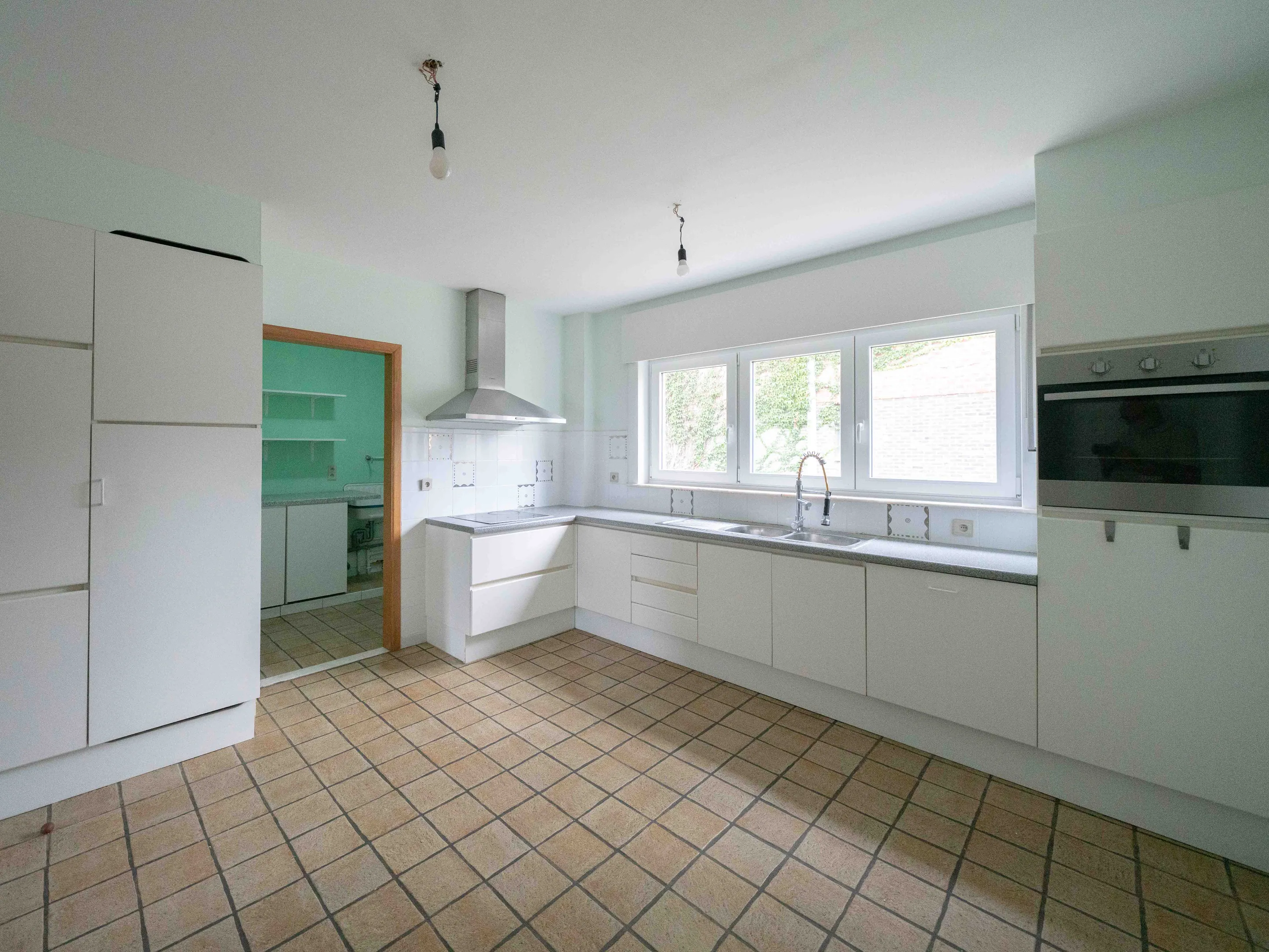 We betreden de woning via een zeer ruime inkomhal van 16m² met gastentoilet. De inkom geeft toegang tot opnieuw een zeer ruime leefruimte (38m²) én ruime keuken (14,5m²). De keuken is voorzien van alle toestellen: frigo met vriesvak, oven, vaatwasser, keramische kookplaat, dampkap. Naast de keuken vinden we een praktische bijkeuken/wasplaats (5m²) die toegang geeft tot de tuin. Hier vinden we de elektrische boiler van 200l (2017) voor alle warm water. Op het gelijkvloers vinden we een eerste kamer (15m²) en badkamer (9m²) met dubbele wastafel, bad en toilet. De woning is voorzien van een inpandige garage (24m²) en een vrijstaande garage (22m²).