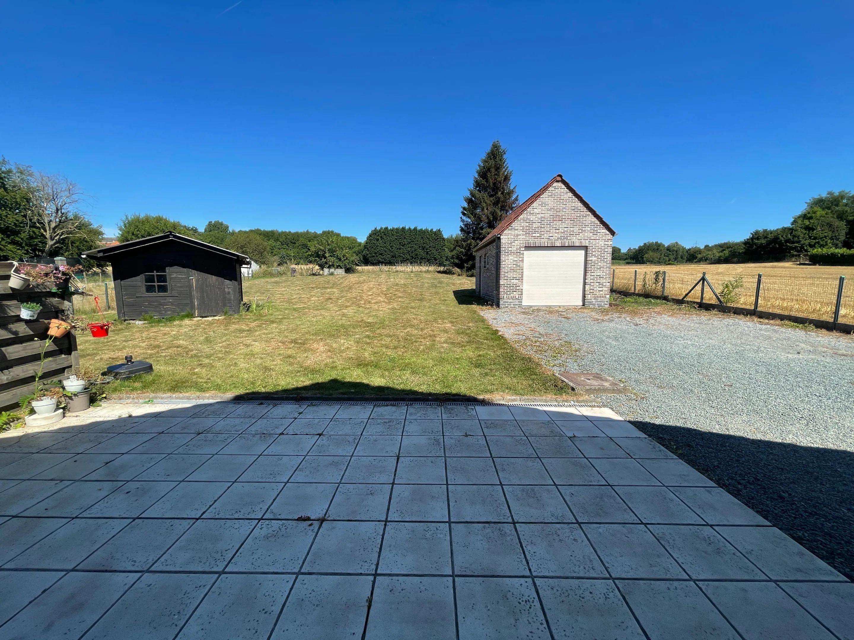 Laat je zeker niet afschrikken door de Noord oriëntatie want gezien de grootte van de tuin kan je een hele dag genieten van de zon. Bovendien is het perceel achter de tuin agrarisch gebied hetgeen een groen zicht garandeert in de toekomst! In het tuinhuis kan u alle tuinmateriaal een plaatsje geven.