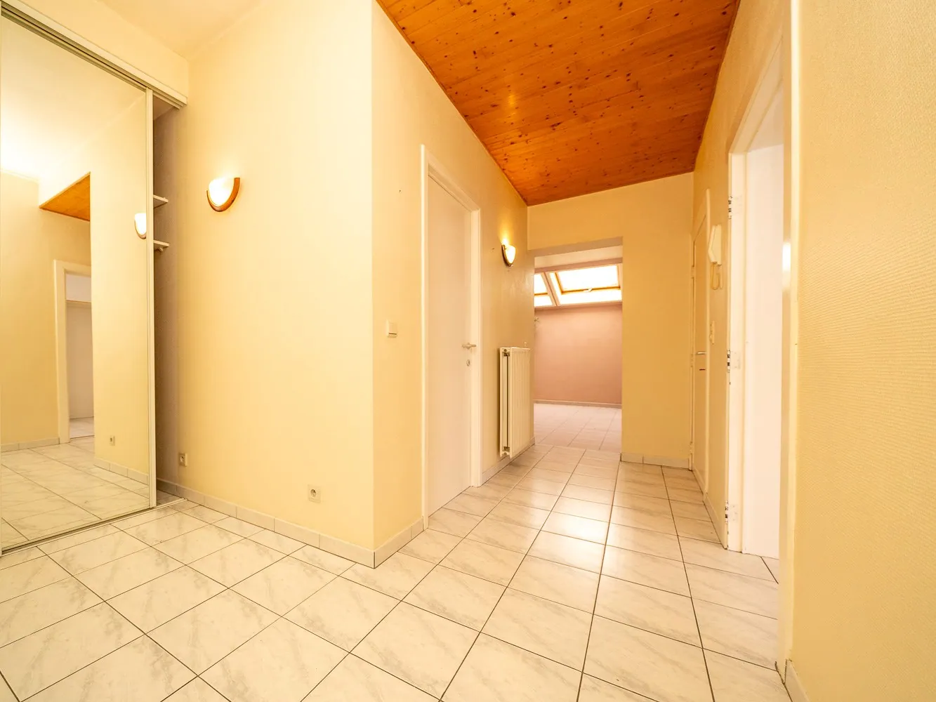 Het lichtovergoten appartement op de eerste verdieping is 91m² en beschikt over een aangenaam en breed terras: een zalige buitenruimte om in de zomer te profiteren. Hier kan je kiezen tussen een slaapkamer op de eerste verdieping of op de tweede verdieping. Van de ruime overloop kan je makkelijk een derde kamer maken.