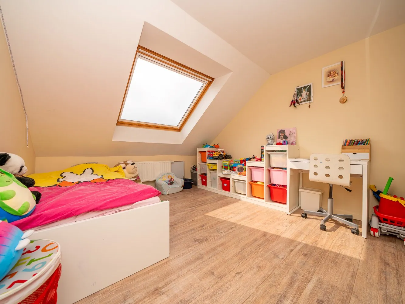 De verdieping voorziet een 1ste grote slaapkamer (15m²), een badkamer met douche, bad en een 2de toilet alsook een berging. De 2de verdieping biedt plaats aan nog 2 correcte kamers (11,5 – 13m²). Eén van beide kamers geeft via een zolderluik toegang tot een zolder die net als de kelder dienst kan doen als opbergruimte.