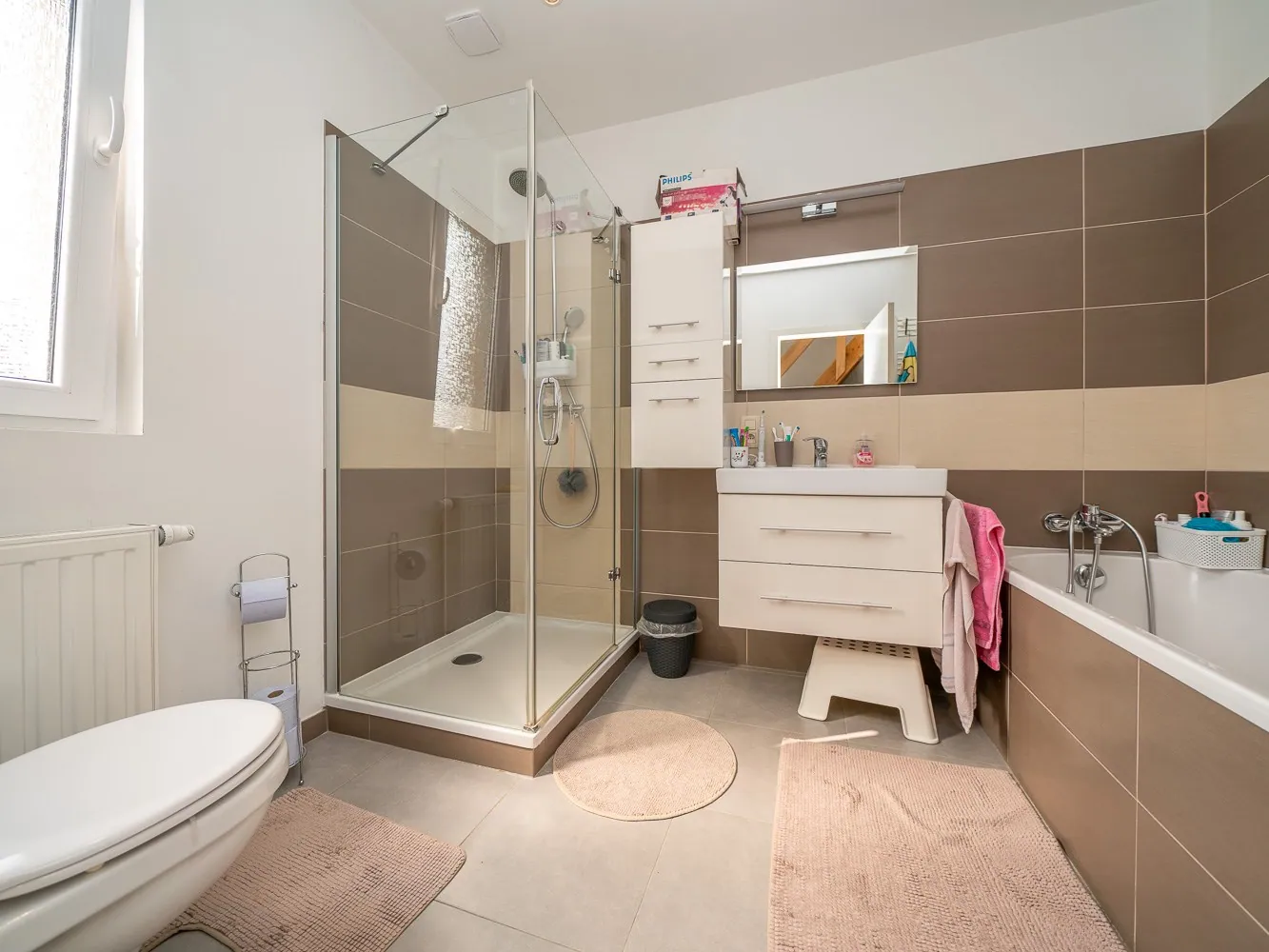 Verwarming gebeurt met een Vaillant gaswandketel die dateert van 2014. Alle beglazing (op één koepel na) is hoog rendement beglazing, de roofing van het plat dak én het hellend dak werden volledig vernieuwd en geïsoleerd, net als de achtergevel.