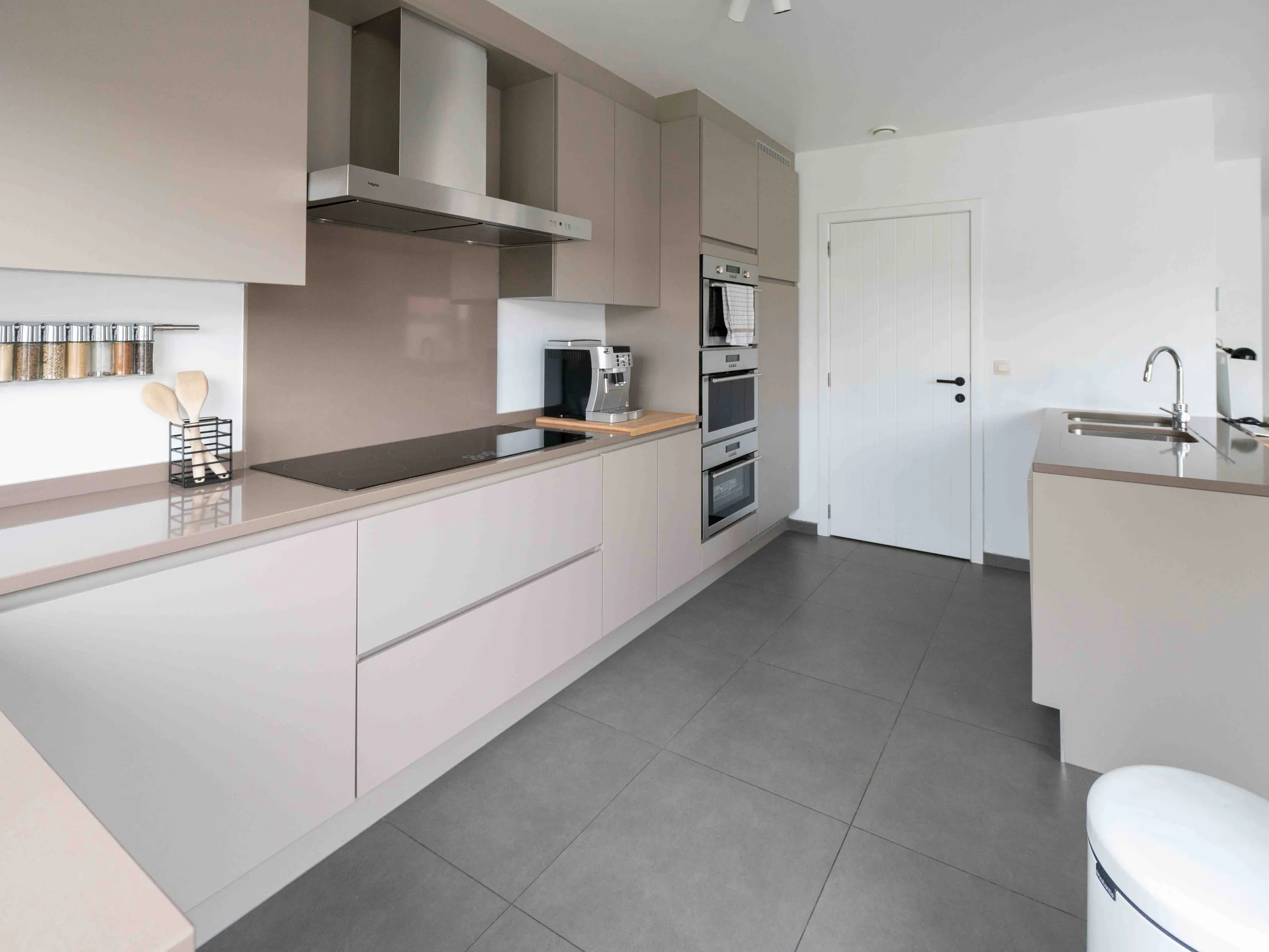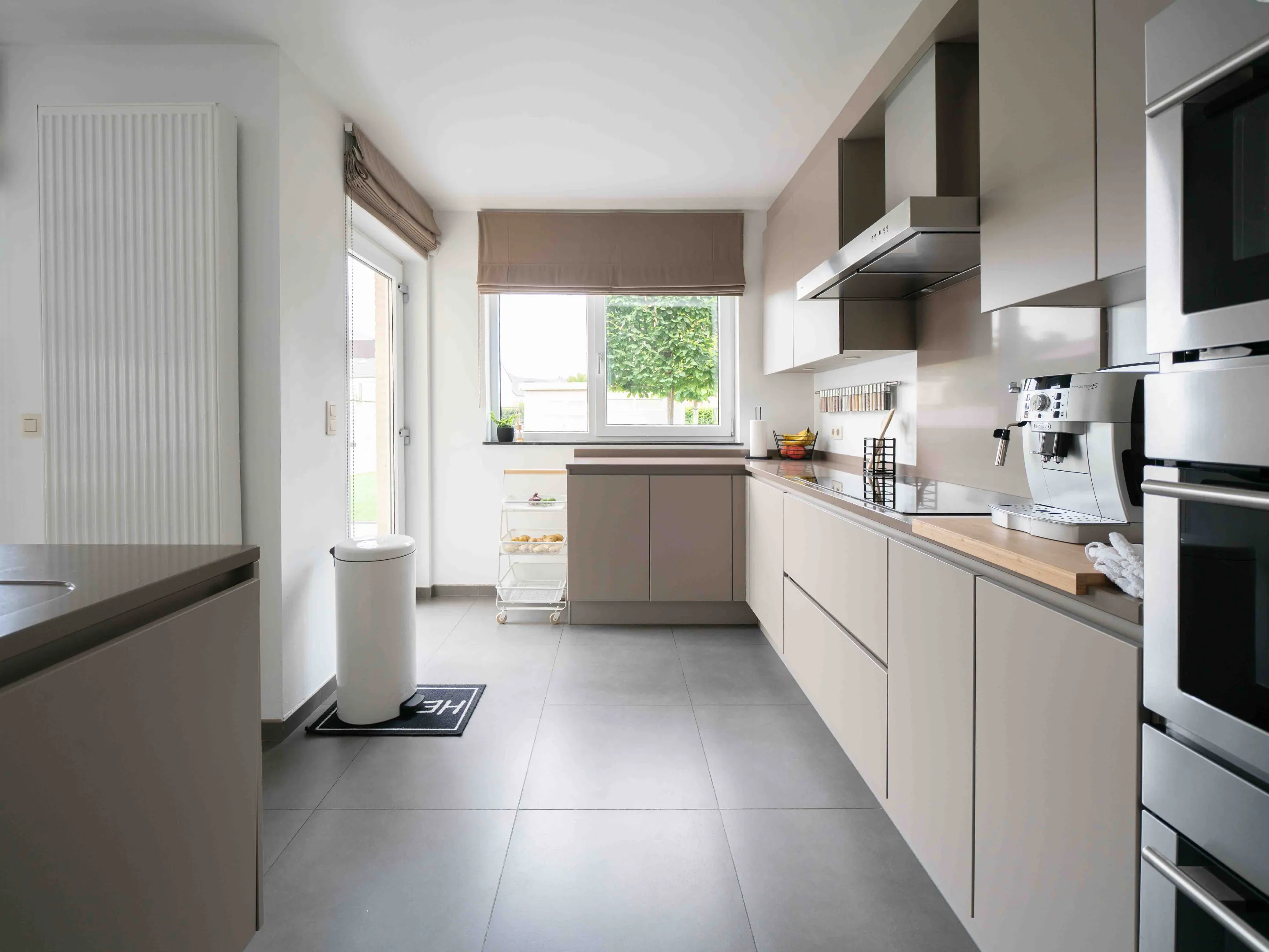 De moderne, open keuken is volledig uitgerust: Smeg inductie kookplaat, grote frigo, vaatwasmachine, (stoom)oven en microgolf. In de naastgelegen praktische berging is ruim voldoende plaats voor een diepvries en bevinden zich tevens de aansluitingen voor wasmachine/droogkast. Onder de trap in de garage is nog een tweede bergruimte.