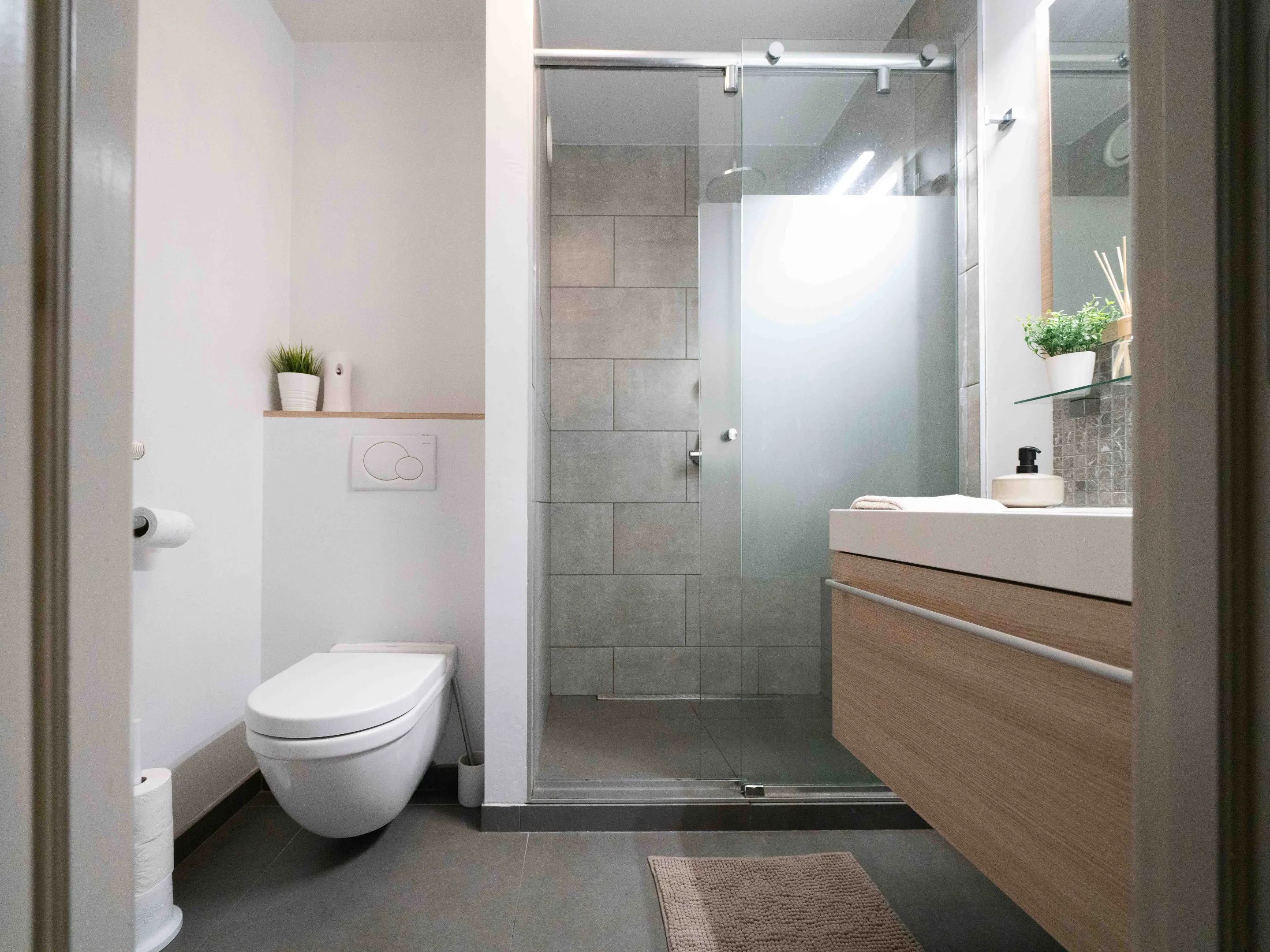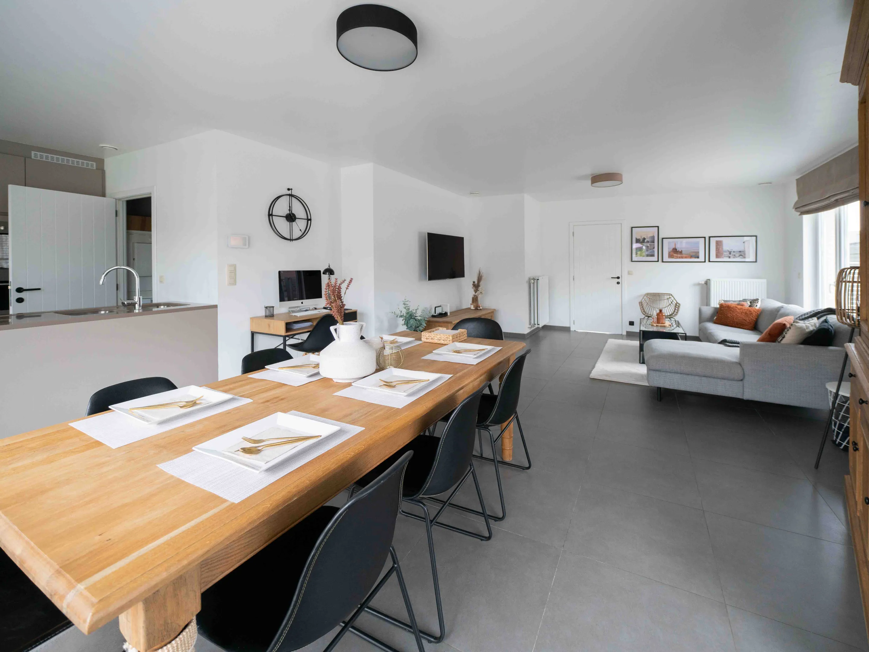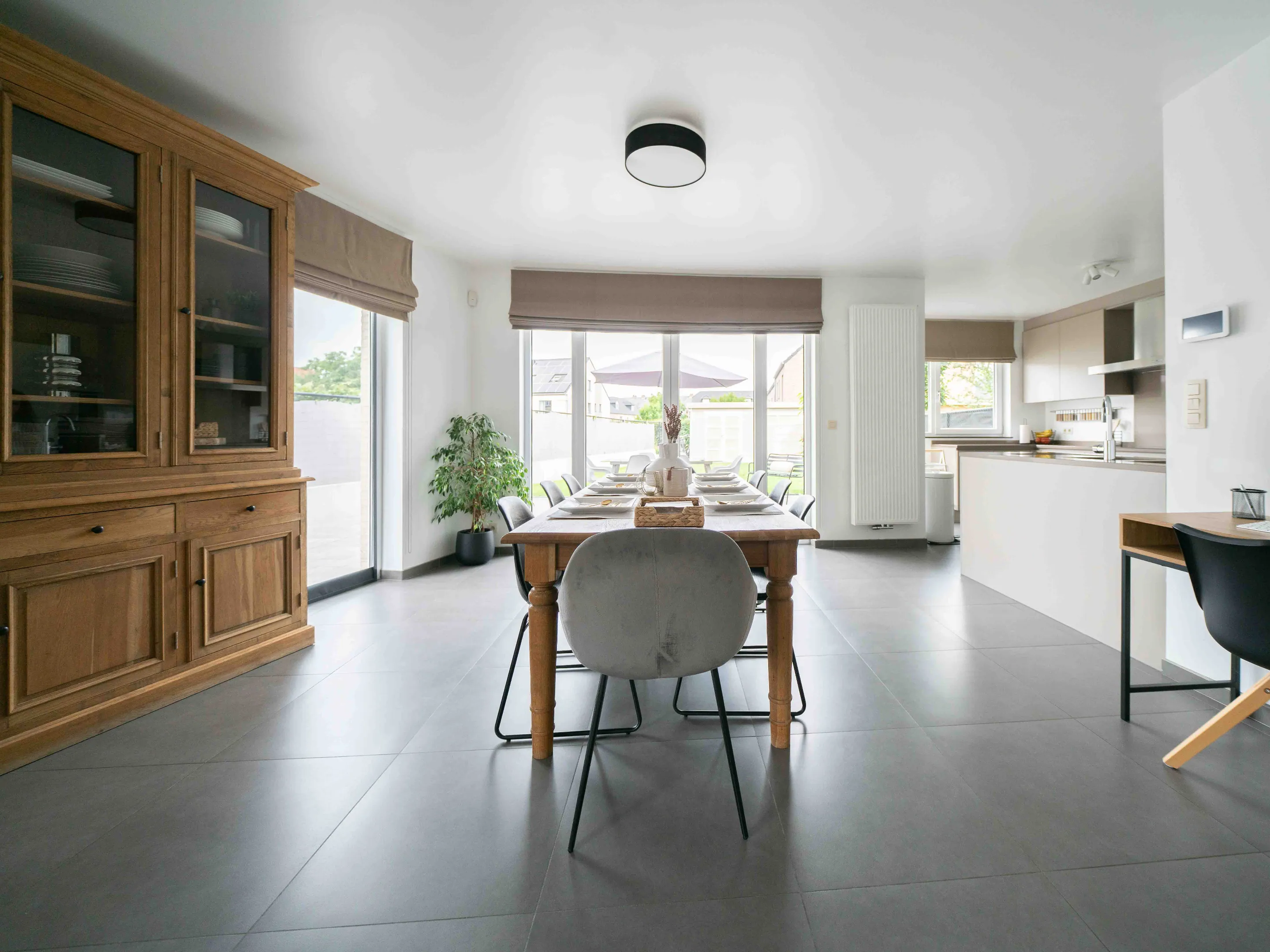 Je betreedt de woning via een inkomhall met gastentoilet voorzien van handwasser en mozaïeken tegels. De ruime living (35m²) en open keuken (11m²) geven toegang tot en hebben zicht op het terras en de tuin.