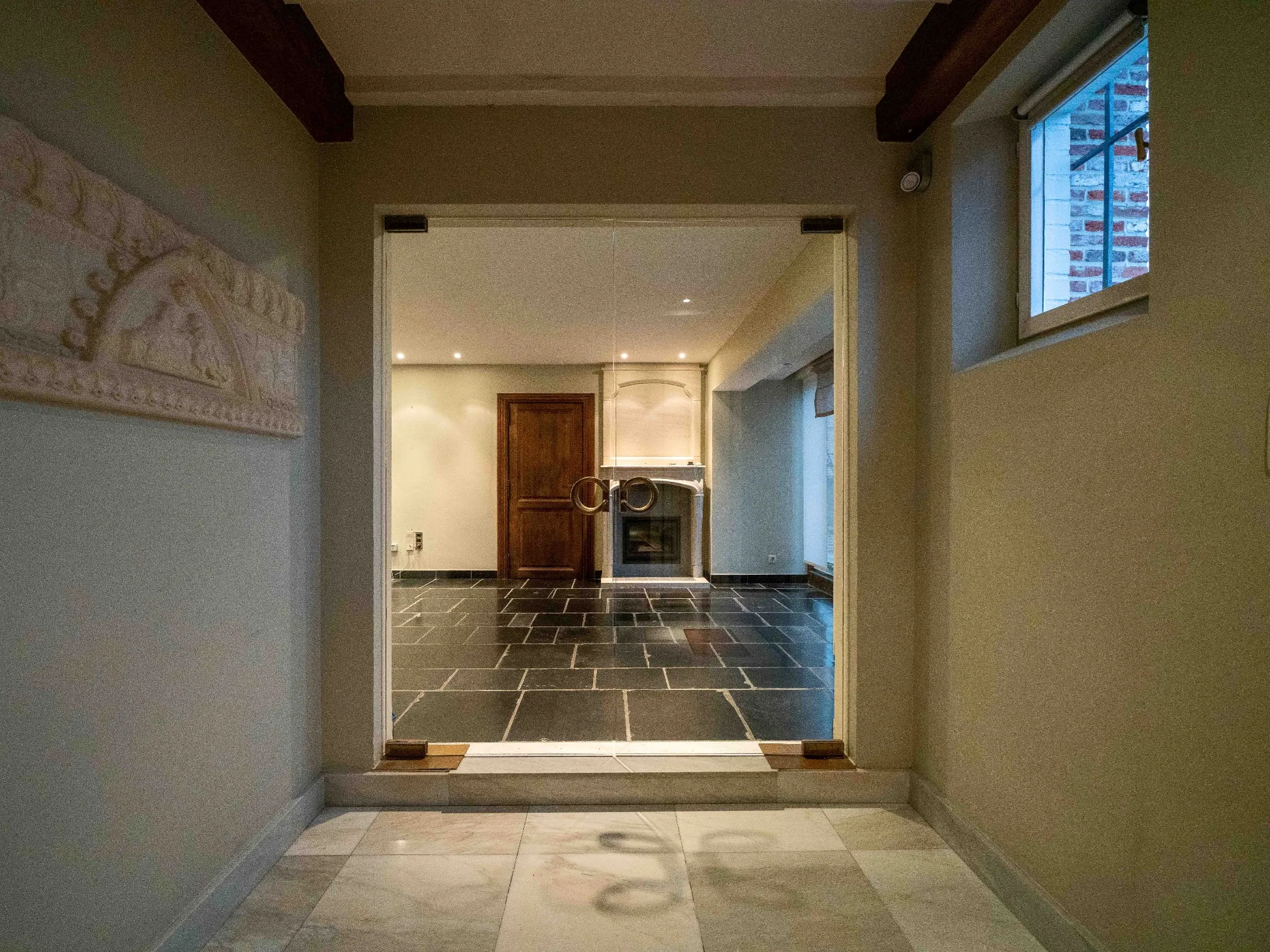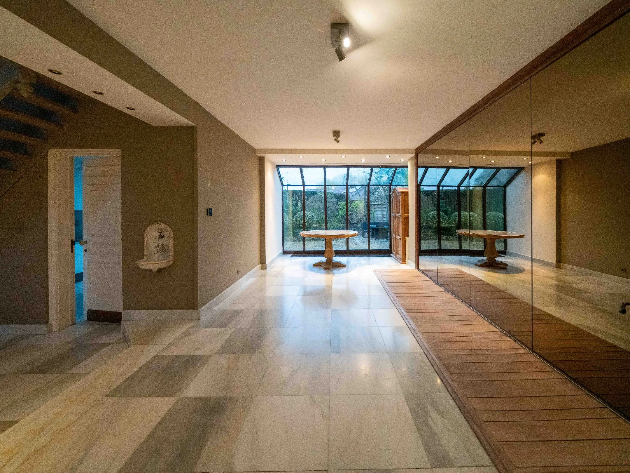 Vooraan rechts vinden we achter een dubbele glazen deur een grote ruimte in natuursteen die nog een eigen invulling kan krijgen. Ideaal voor een vrij beroeper of kleine zelfstandige. Achteraan is een handige wasplaats en een droge kelder op stahoogte.