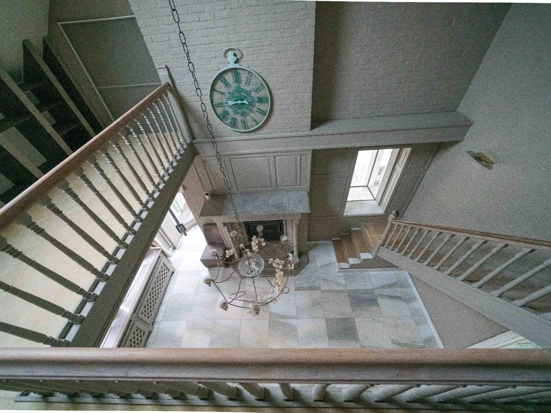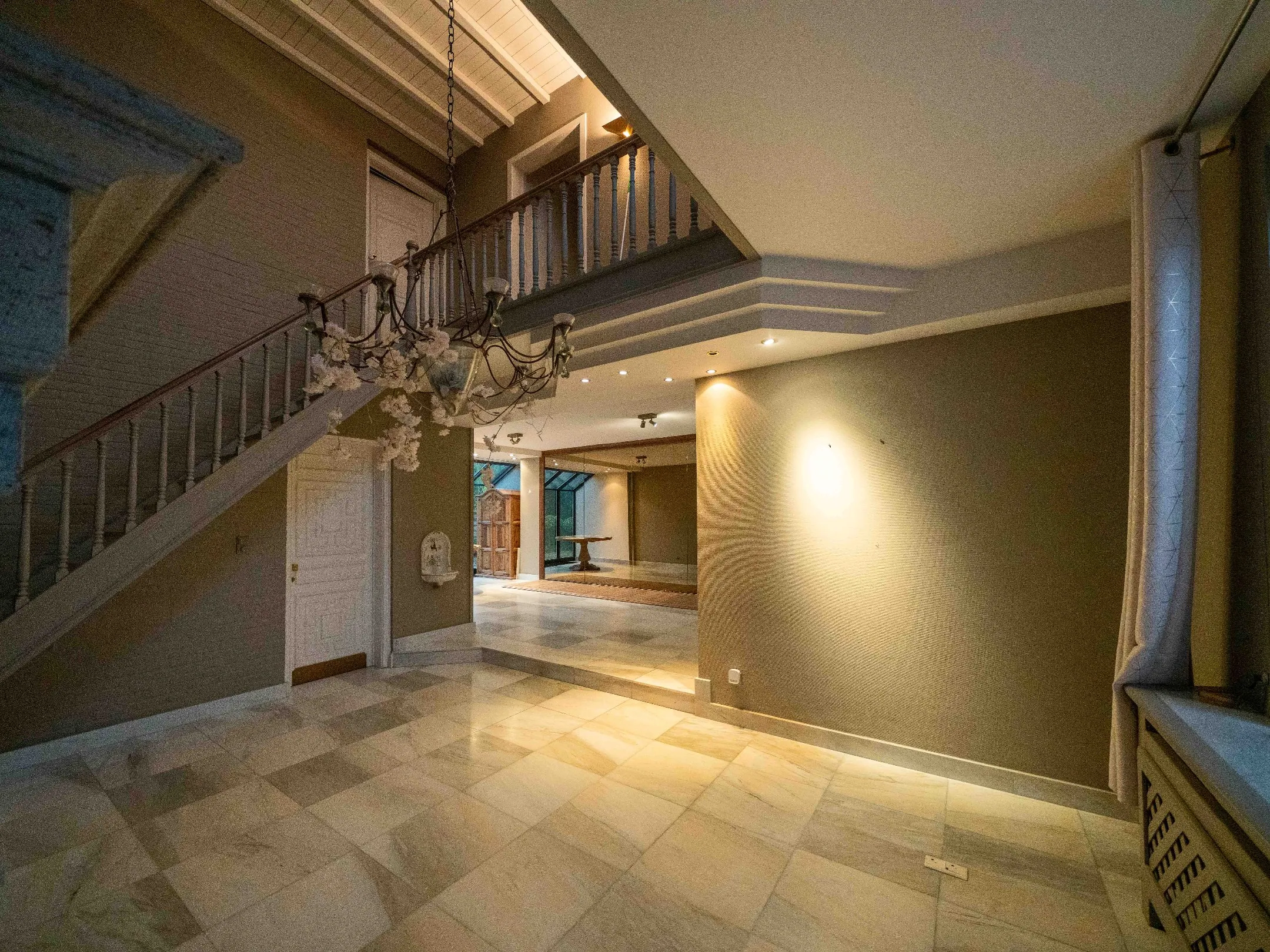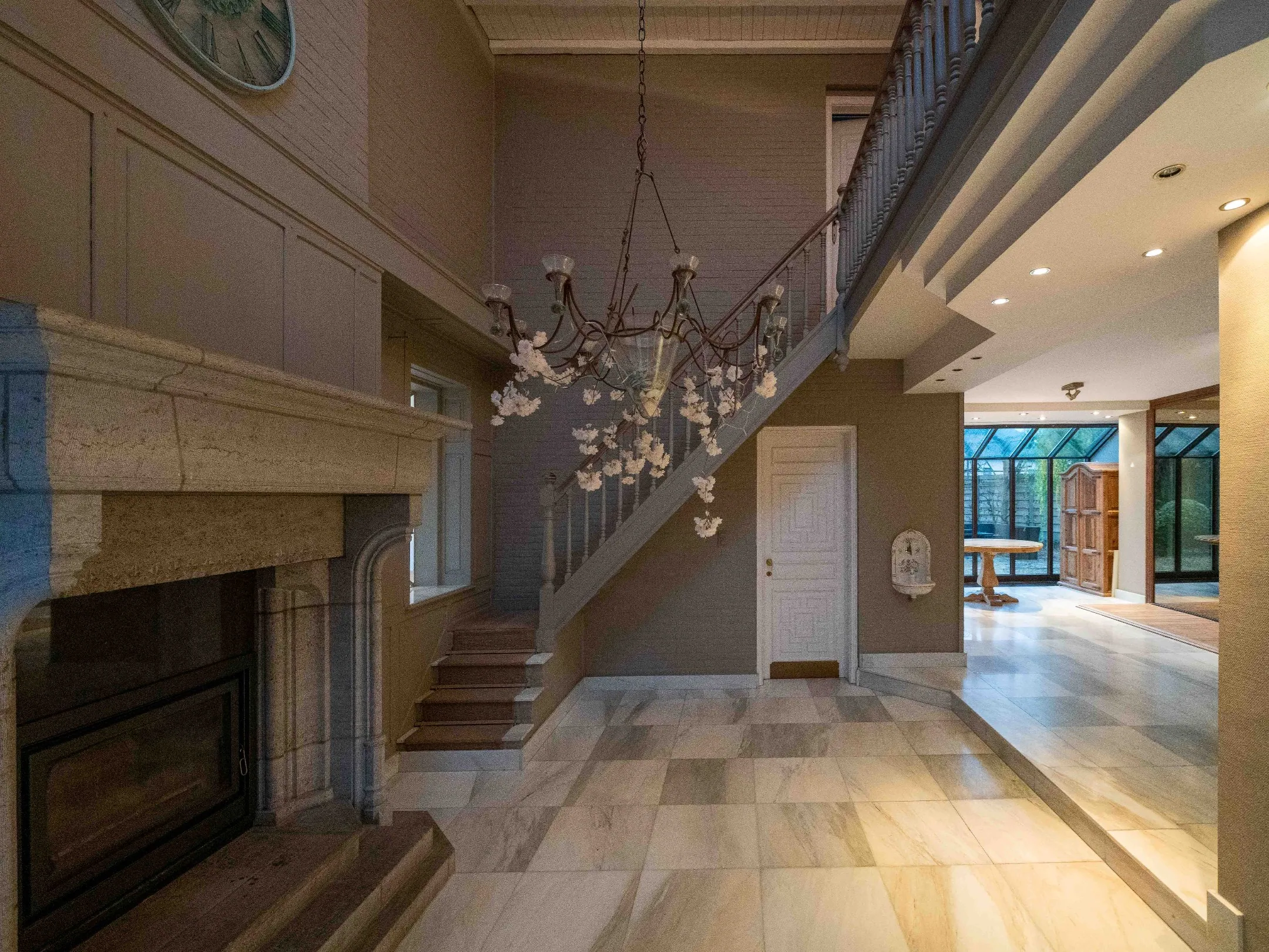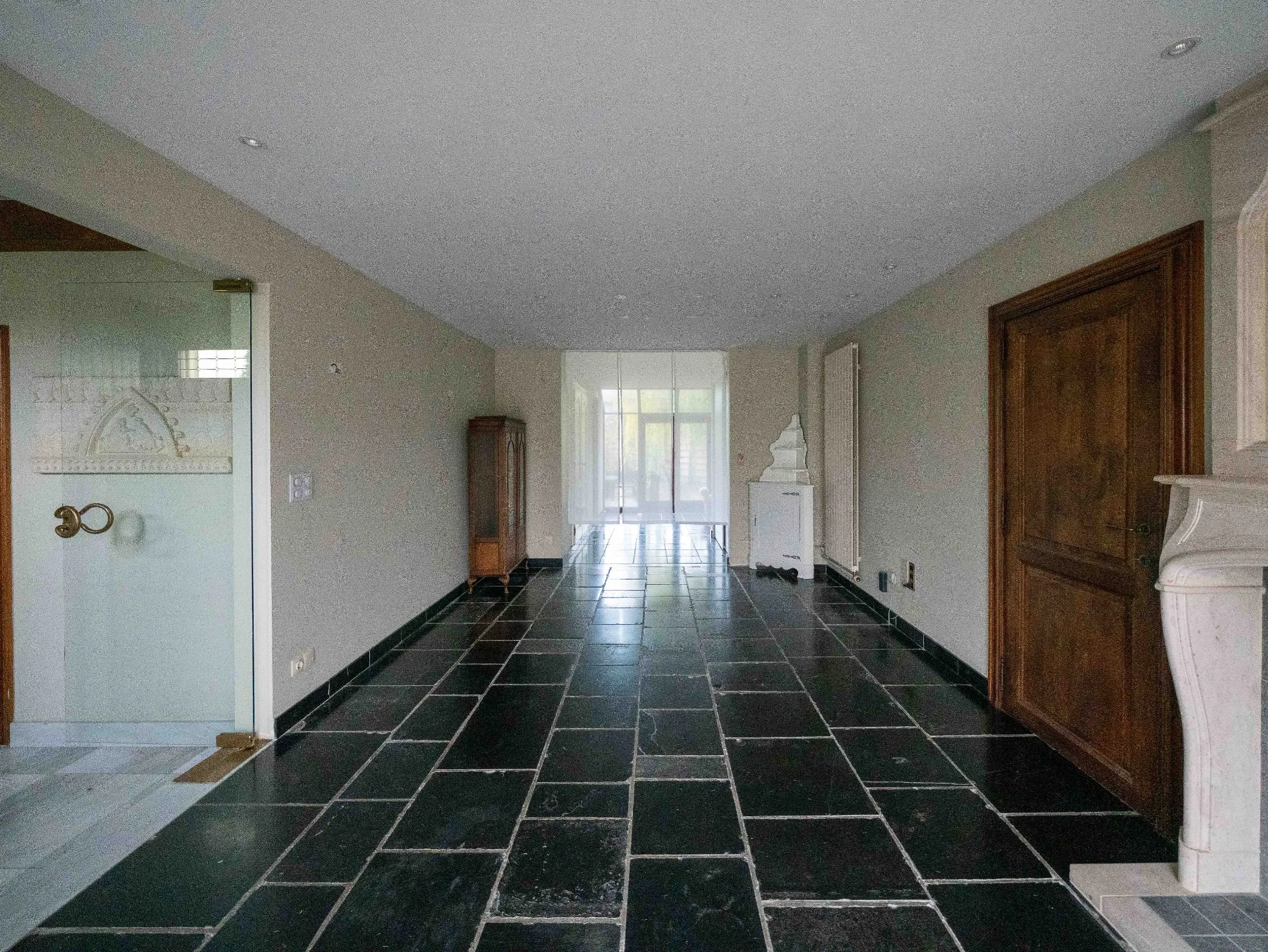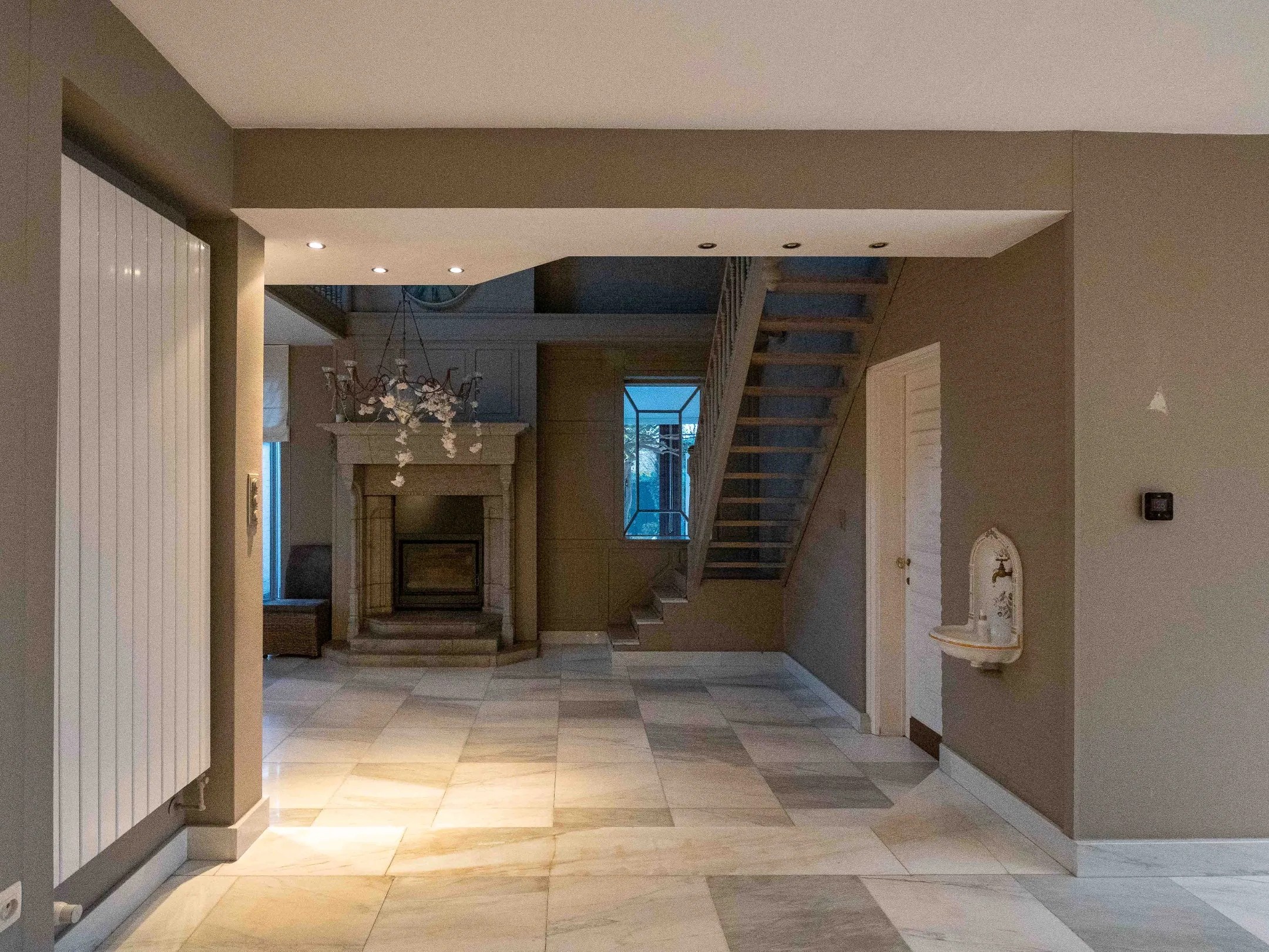 Links hebben we toegang tot een zeer ruime woonkamer en super sfeervolle salonhoek met originele open haard. De giga keuken is voorzien van kwaliteitstoestellen en veel kastruimte.