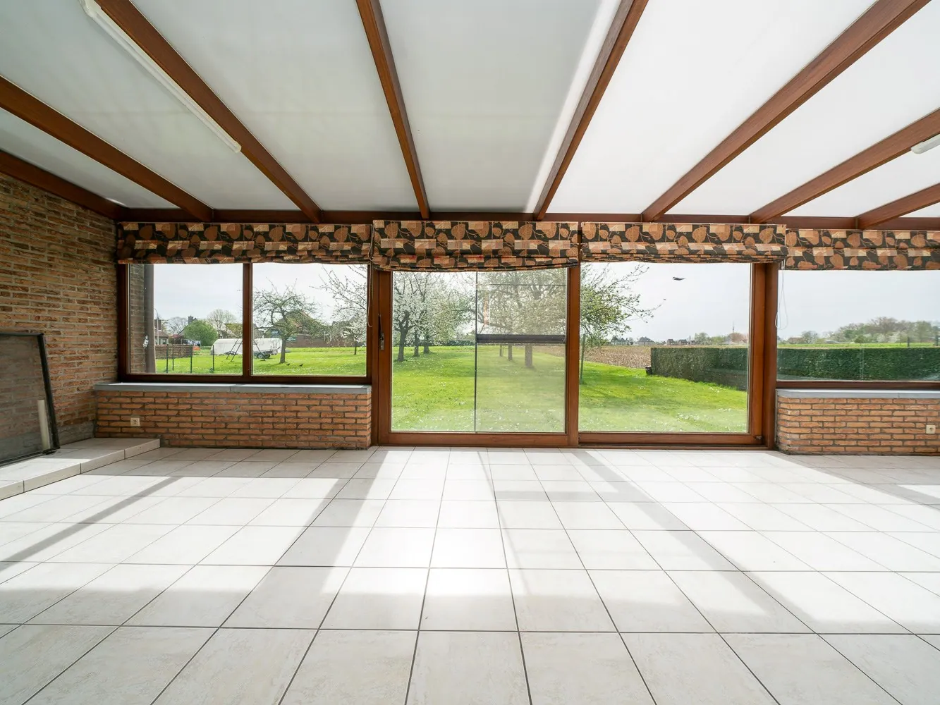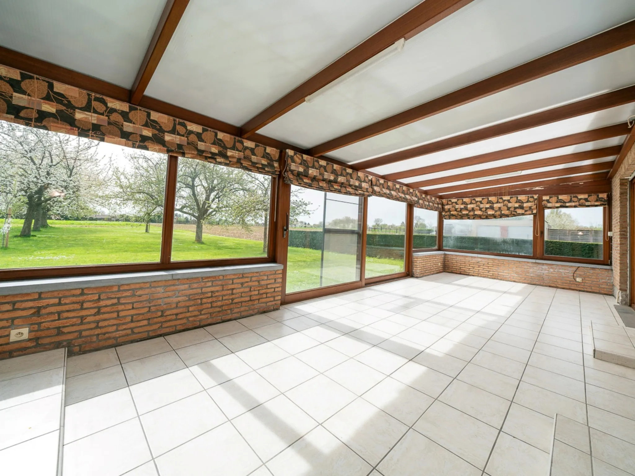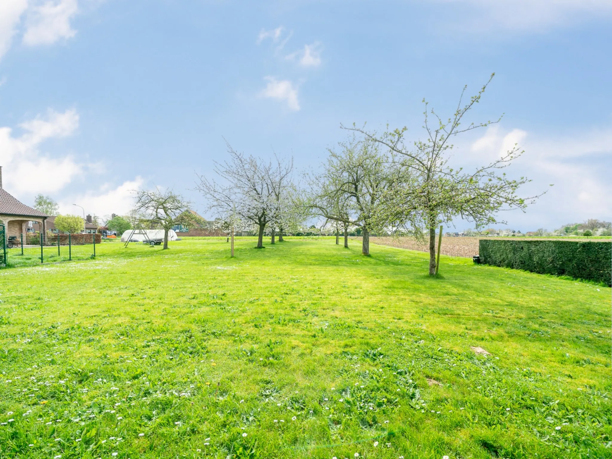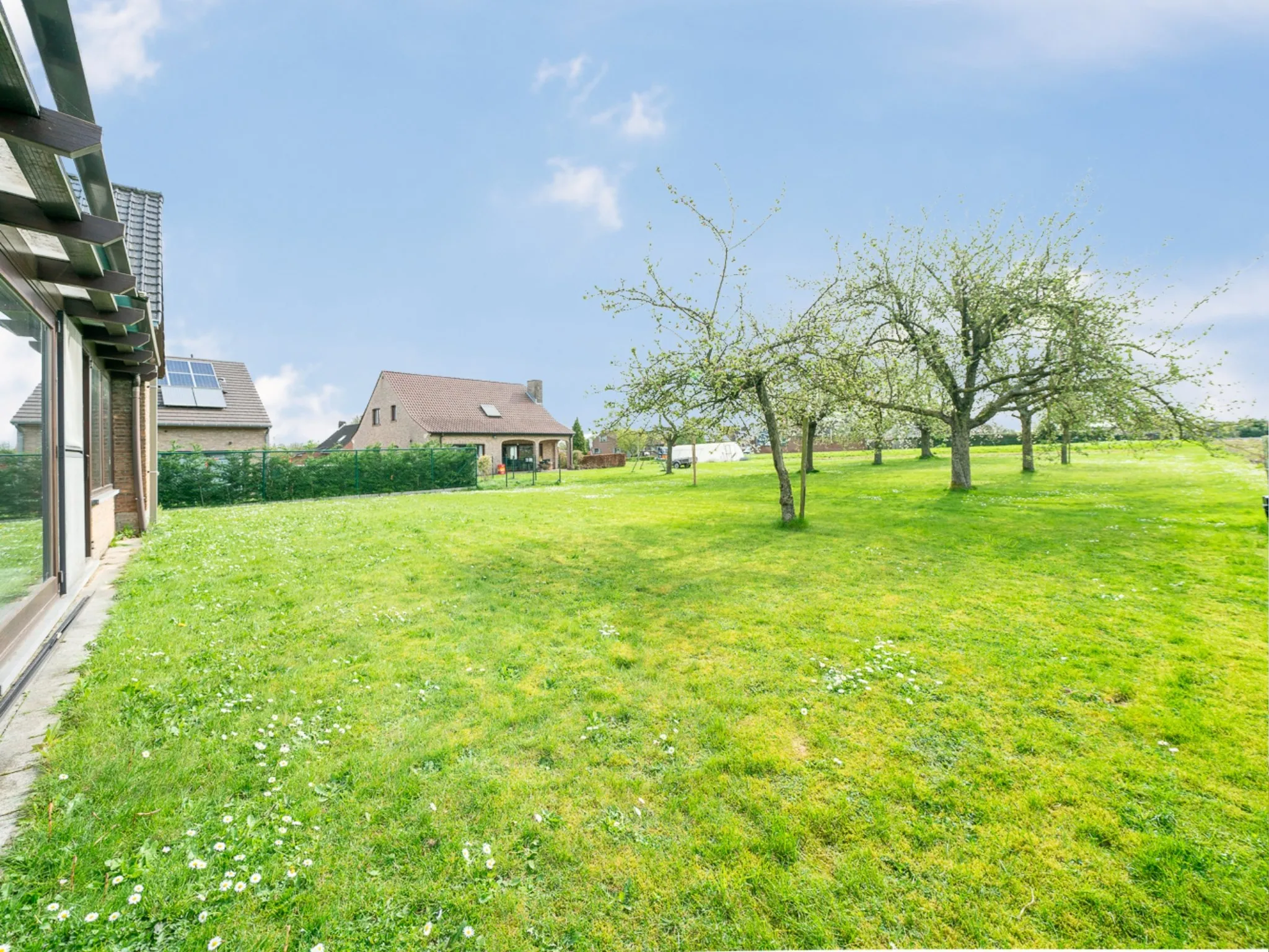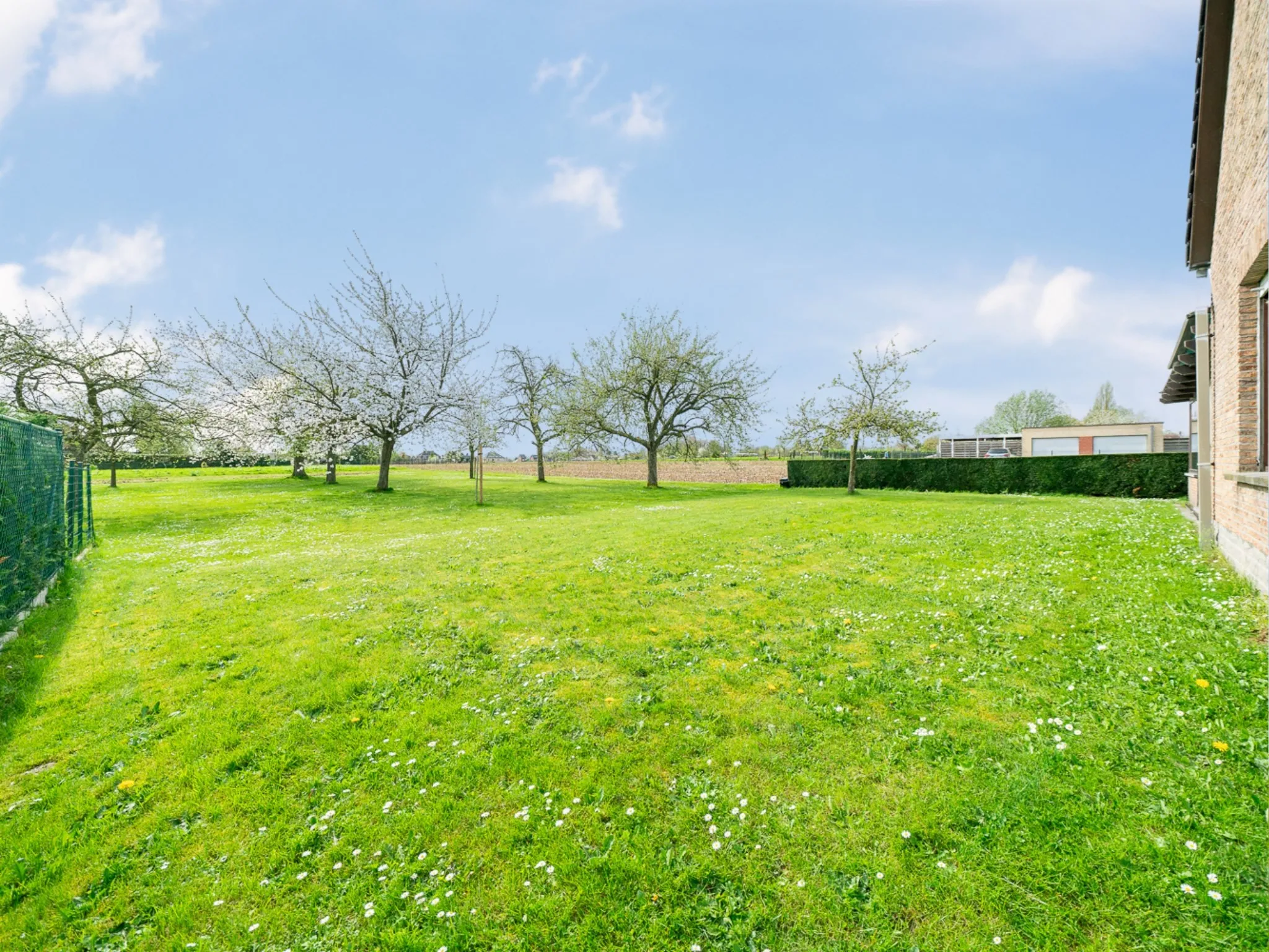 De tuin ligt rond de woning, maar het beste stukje is ongetwijfeld achteraan: zuidoost georiënteerd en een open zicht op de fruitbomen van de buur of het naastgelegen weiland. Het begrip “landelijk” krijgt hier een duidelijke betekenis.