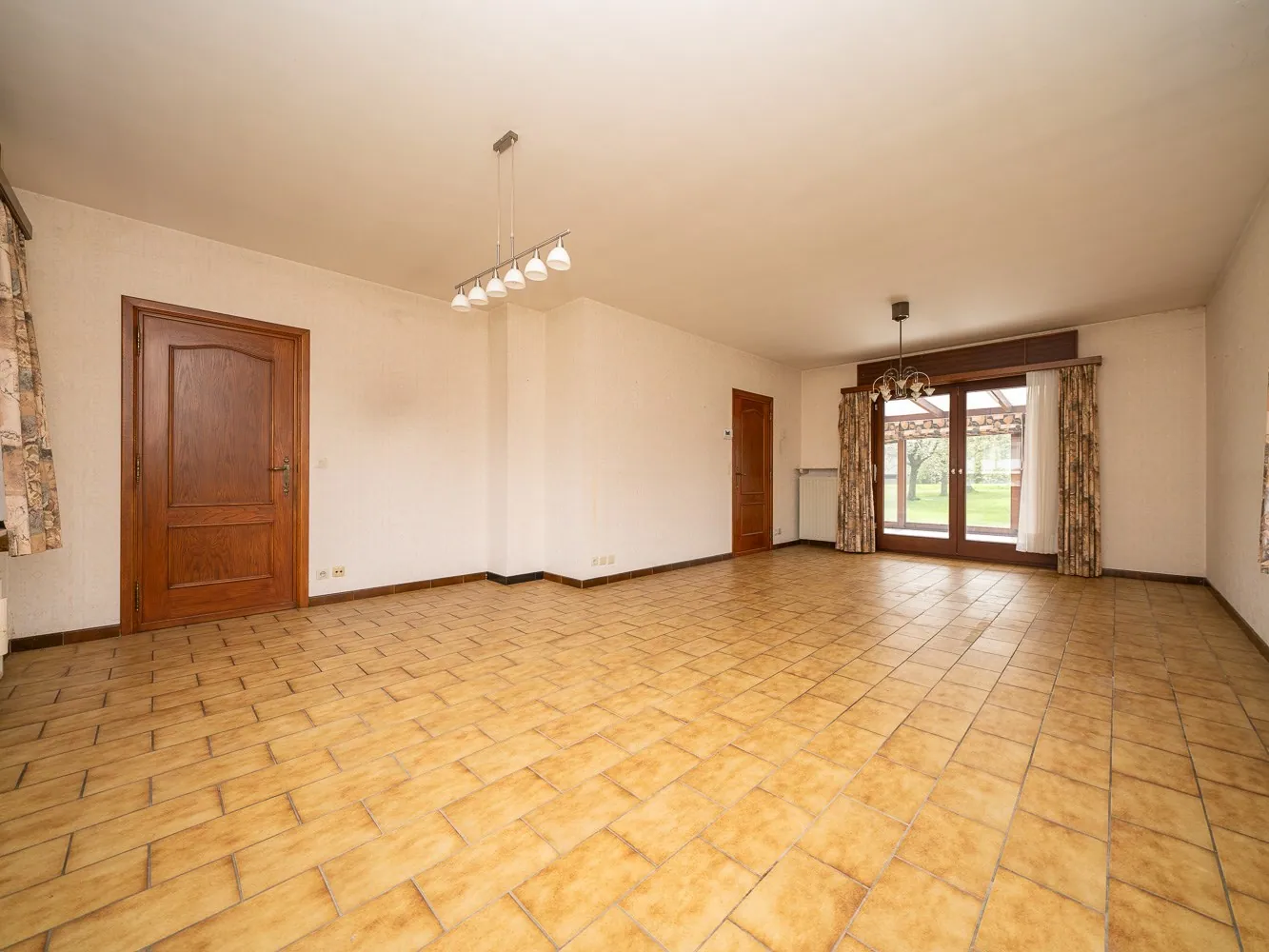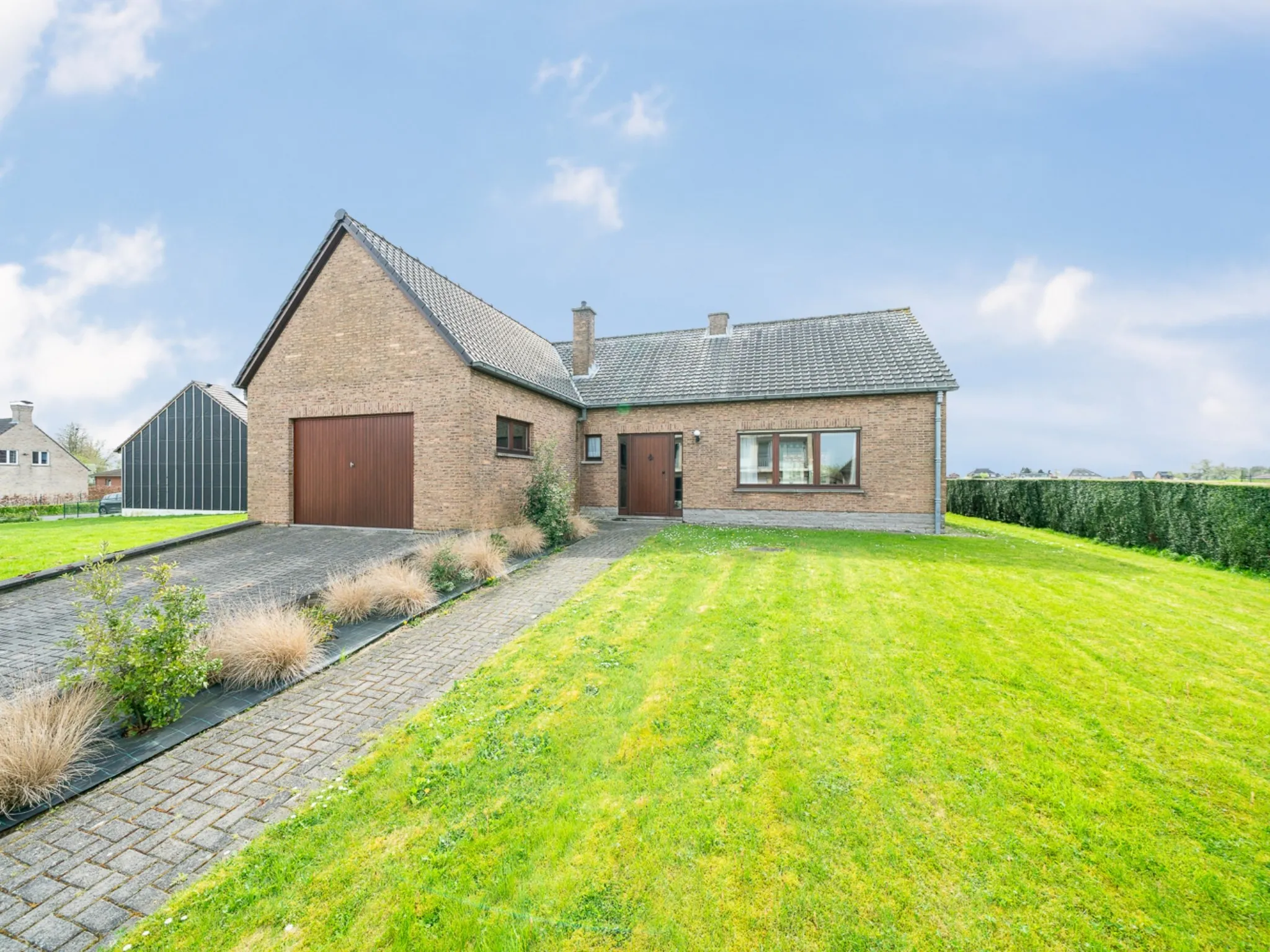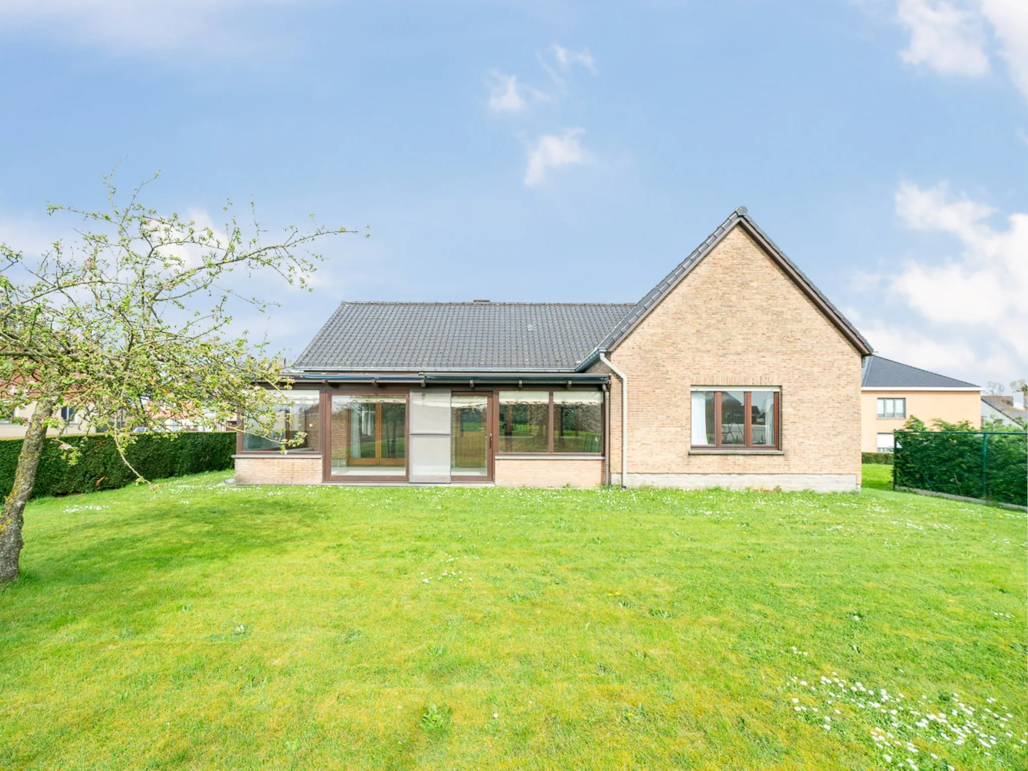 De woning betreed je via de grote inkomhal met gastentoilet en vestiaire. De deur rechts brengt je naar de leefruimte, lichtrijk dankzij de grote raampartijen rondom. Centraal in de woning ligt de keuken met praktisch berging, handig voor de machines of als voorraadkamer. Achteraan ligt de aangename veranda die bereikbaar is zowel via de leefruimte als via de keuken, ideaal voor het zondags ontbijt.