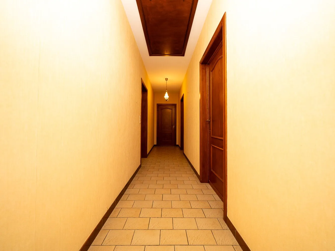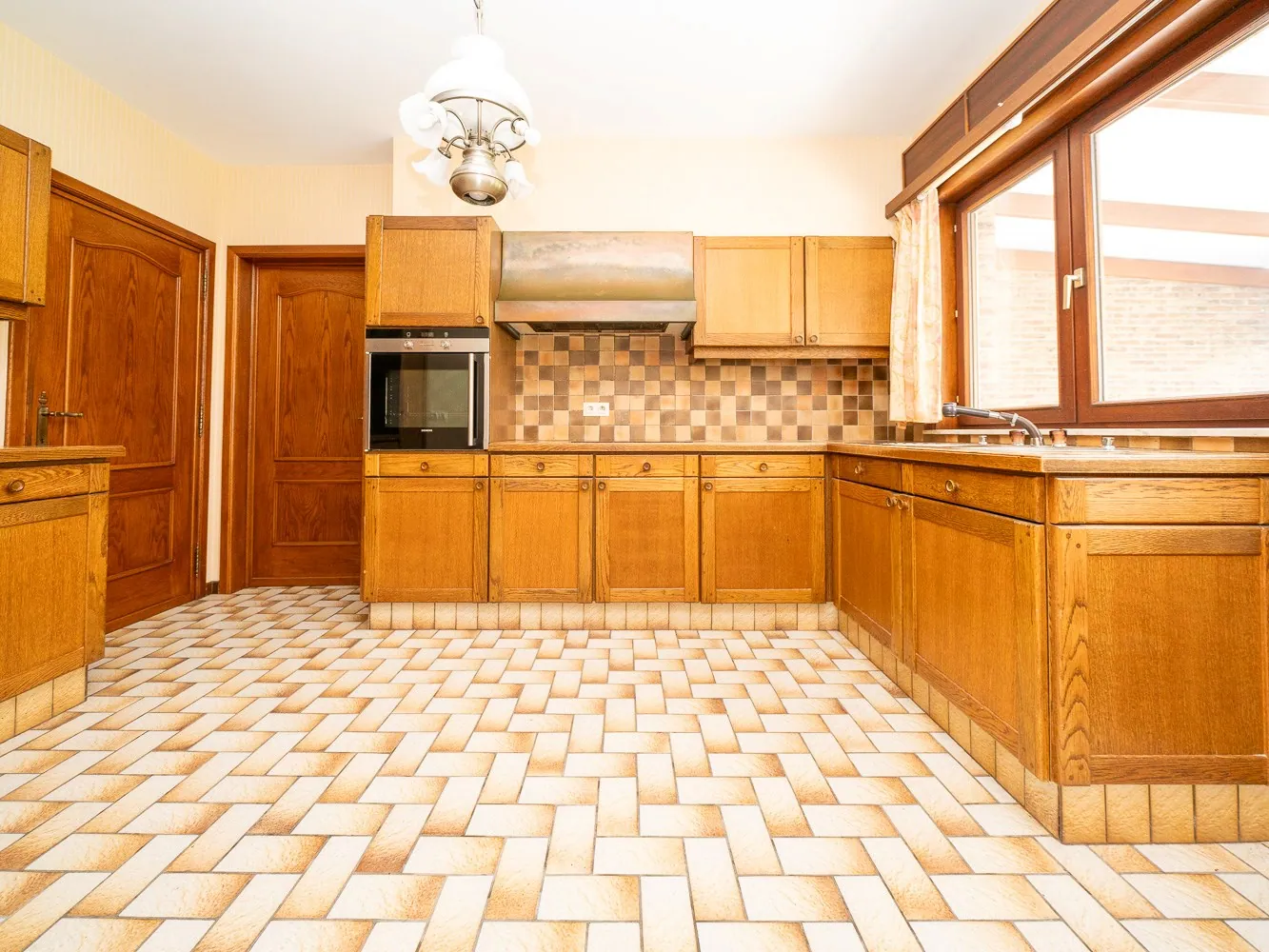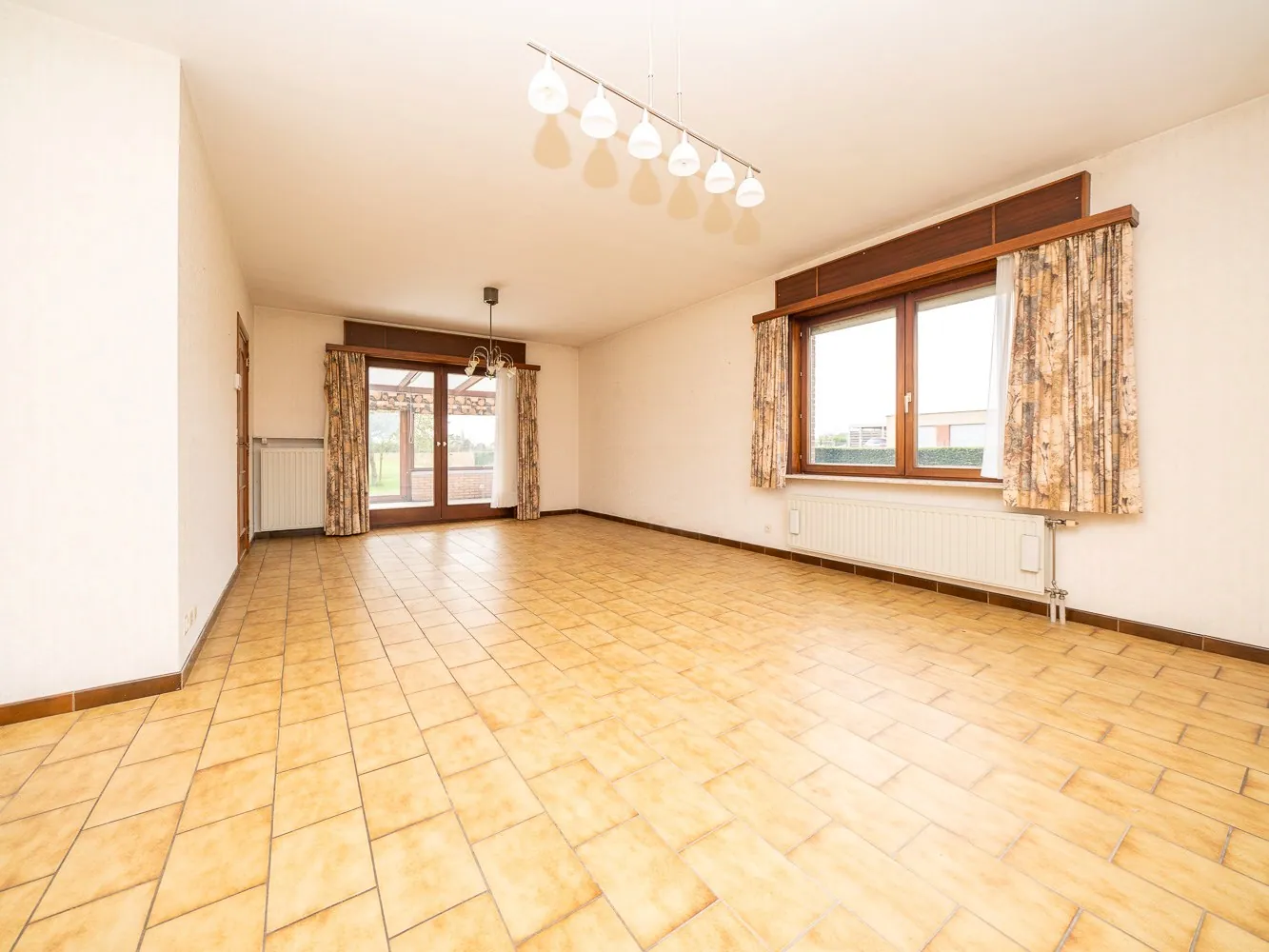 De woning betreed je via de grote inkomhal met gastentoilet en vestiaire. De deur rechts brengt je naar de leefruimte, lichtrijk dankzij de grote raampartijen rondom. Centraal in de woning ligt de keuken met praktisch berging, handig voor de machines of als voorraadkamer. Achteraan ligt de aangename veranda die bereikbaar is zowel via de leefruimte als via de keuken, ideaal voor het zondags ontbijt.