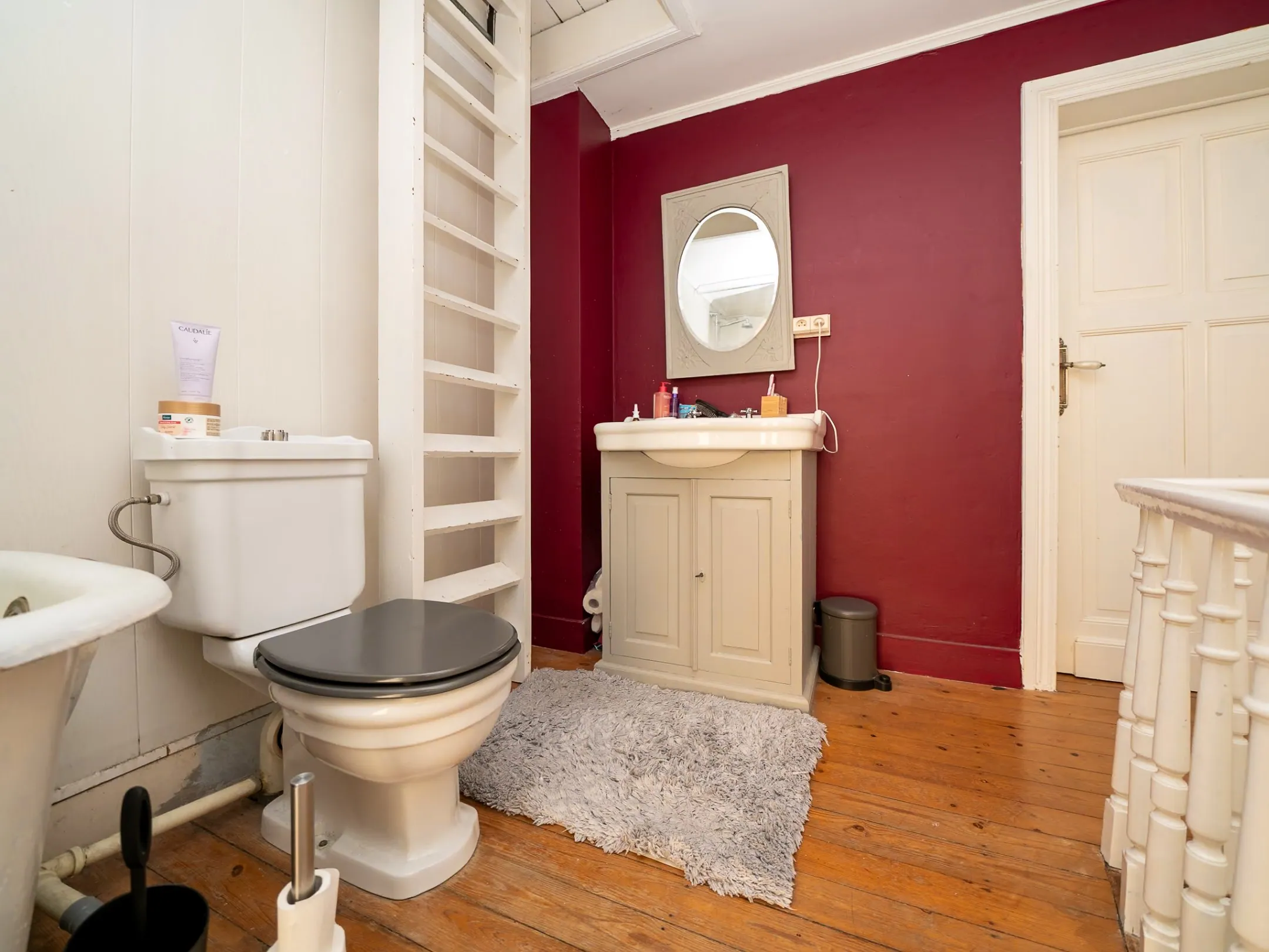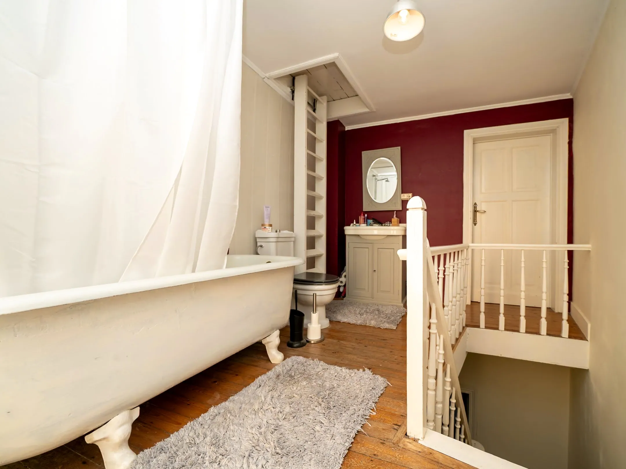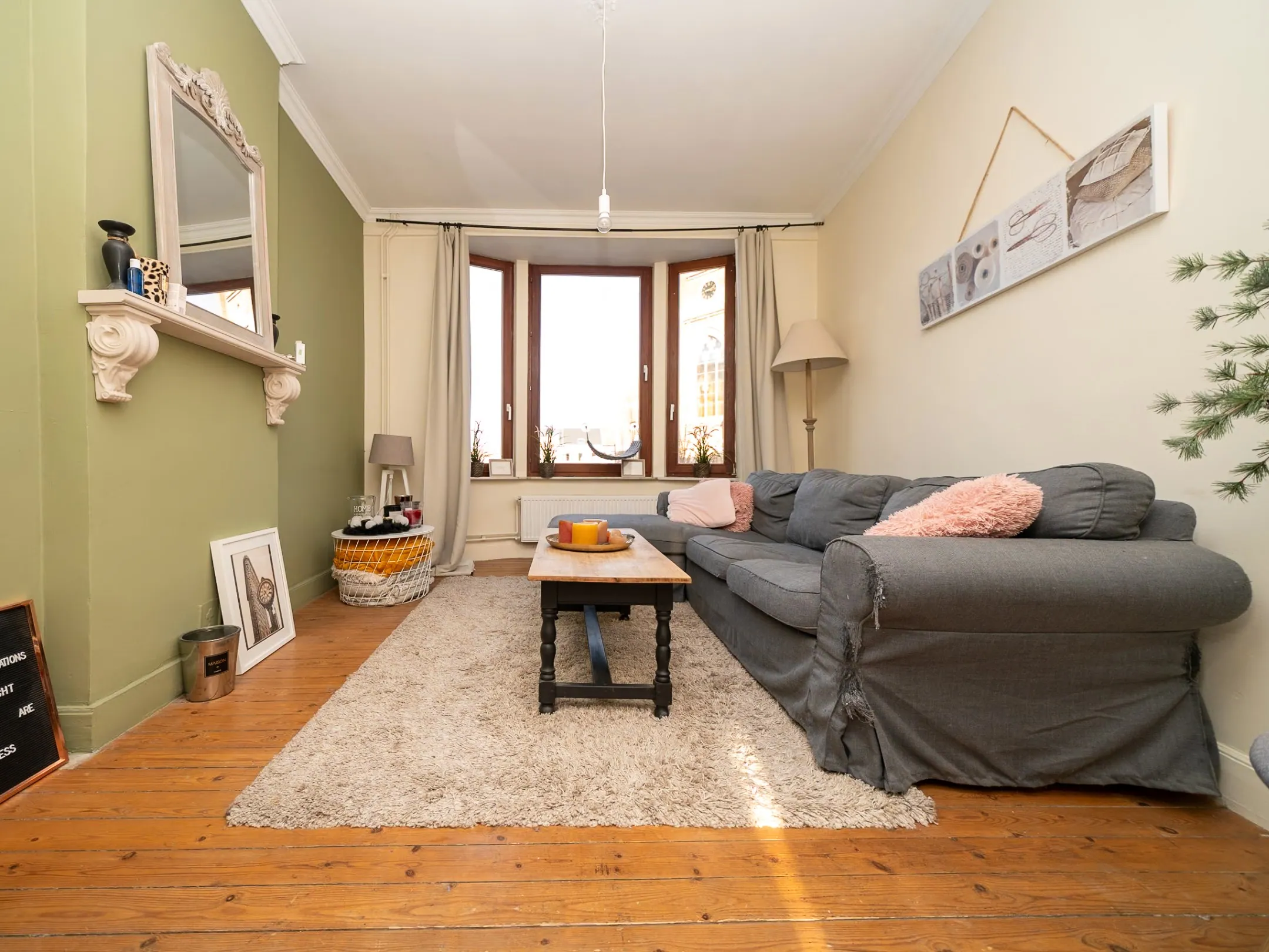 Begeef je je één verdieping naar boven, dan kom je in het sfeervolle salon op warme plancher vloer. Van hieruit heb je zicht op de kerktoren, kan slechter hé? 😉 De ruime overloop doet dienst als bureauhoekje.