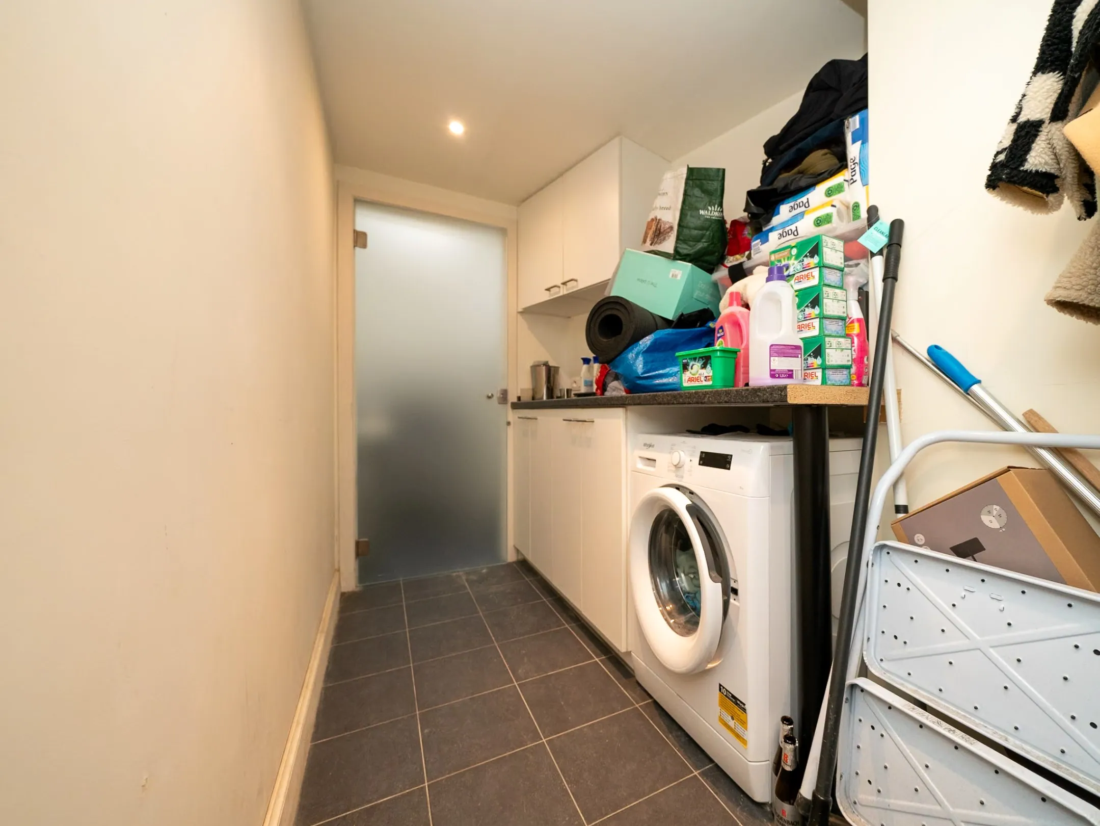 Binnenvallen doe je hier met de deur in huis. Achter de voorgevel schuilt meteen de woonkamer met achtergelegen de keuken - beide met een zalig tegeltje, zoals het hoort achter een charmante gevel. Voorts vind je op het gelijkvloers een berging met aansluiting voor wasmachine en een afzonderlijk toilet. De berging geeft toegang tot een kruipkelder.